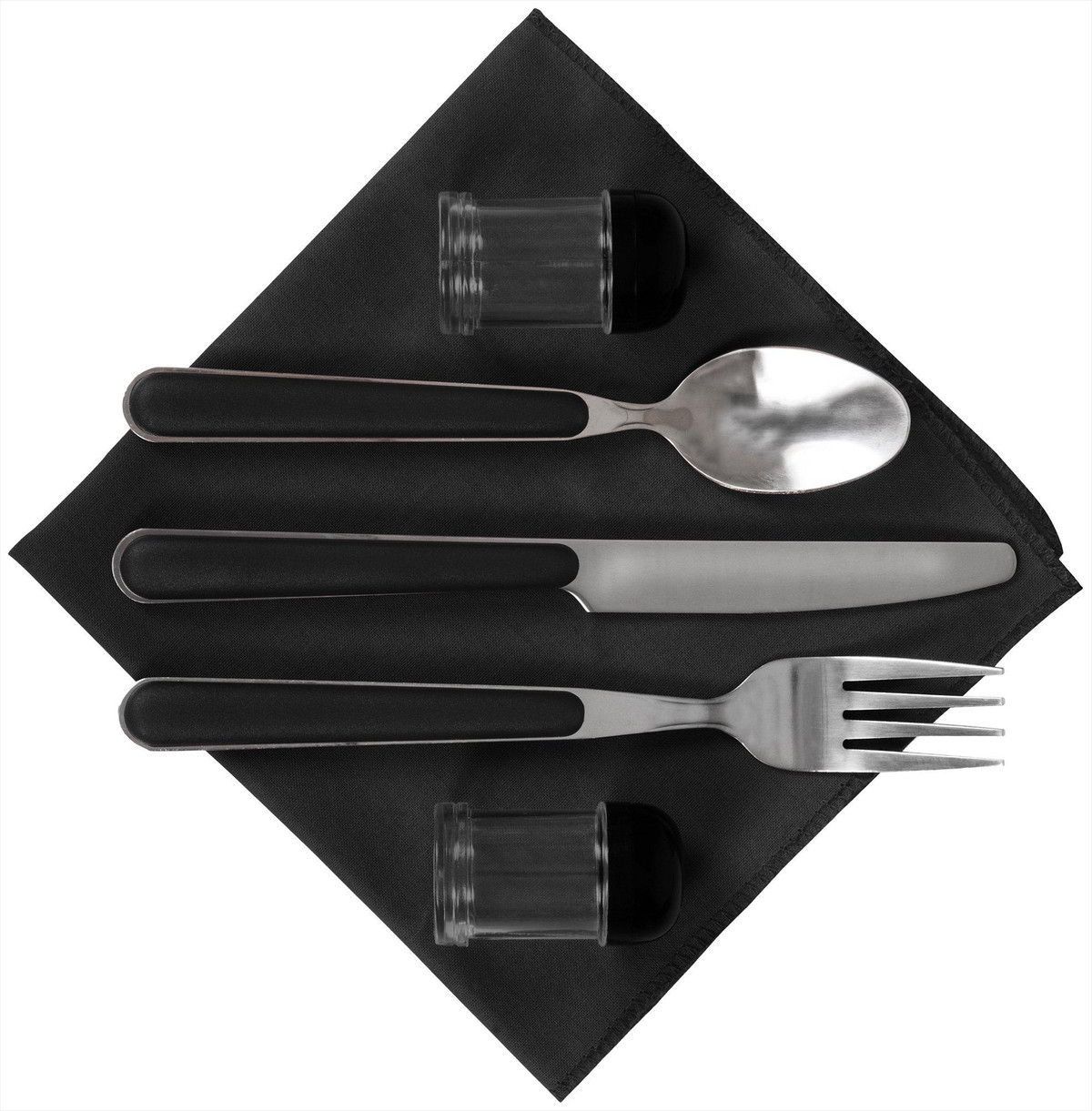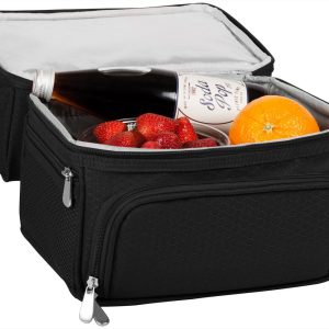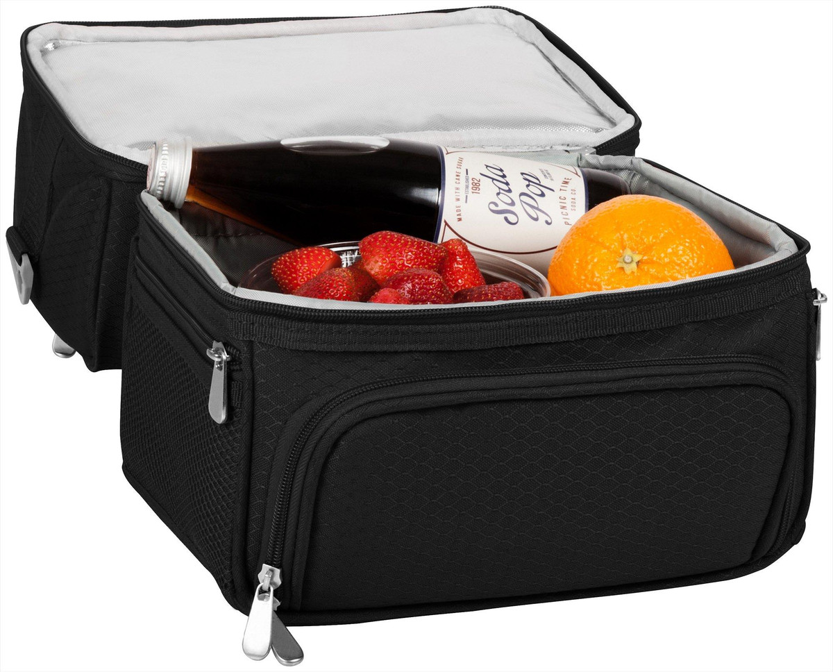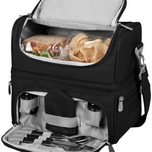The Pranzo insulated lunch box is made of polyester and features adjustable shoulder strap, soft grip handle, side mesh pockets, and a hidden flatware section with 1 stainless steel fork, knife, and spoon, salt & pepper shaker and 1 cotton napkin. Measures 12”L x 8”W x 11”H.