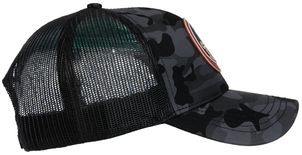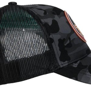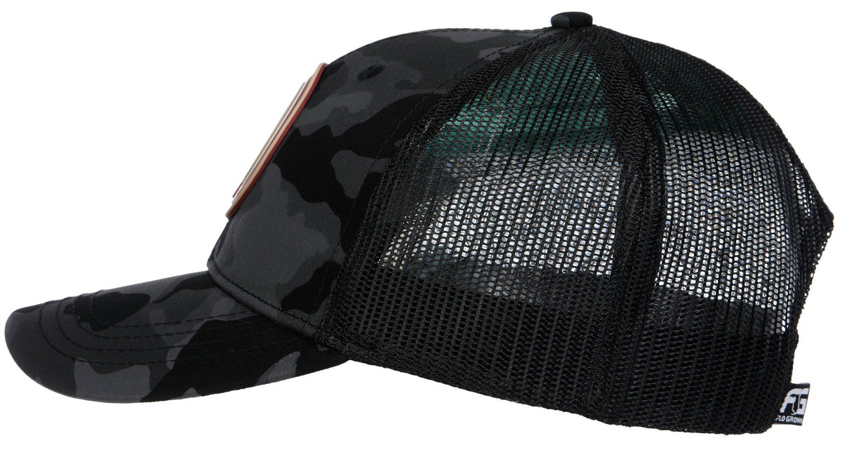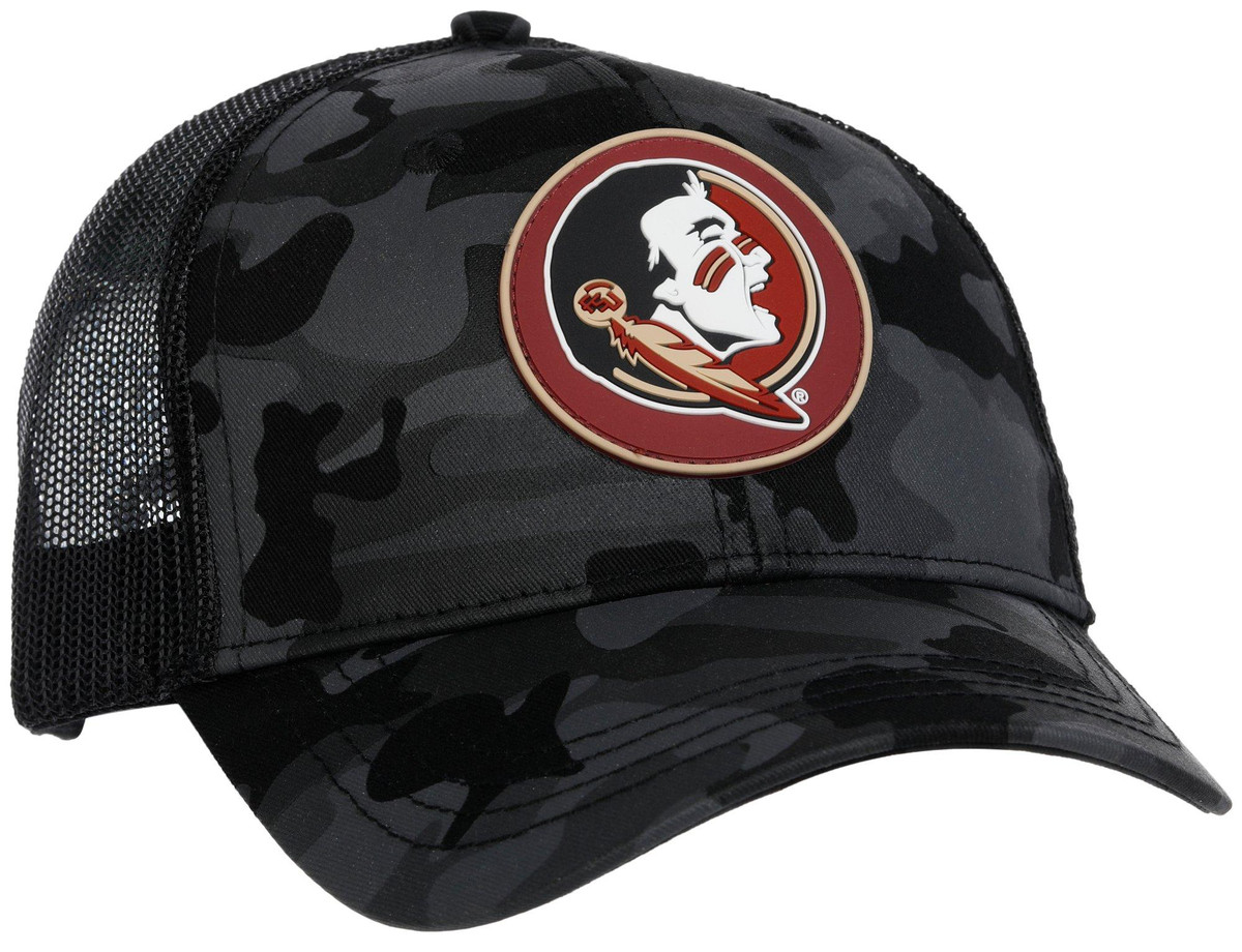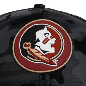 Support your team with bold style in this Mens Florida State Seminoles Black Camo Logo Hat. Featuring a camo pattern front panel with a Seminoles patch, surrounded by solid patterned mesh for a rugged look and to allow air flow. Adjustable for a custom fit. Ideal for outdoor events, tailgates, or everyday wear. Spot clean for best care. Fabrication is 50% cotton, 50% polyester.