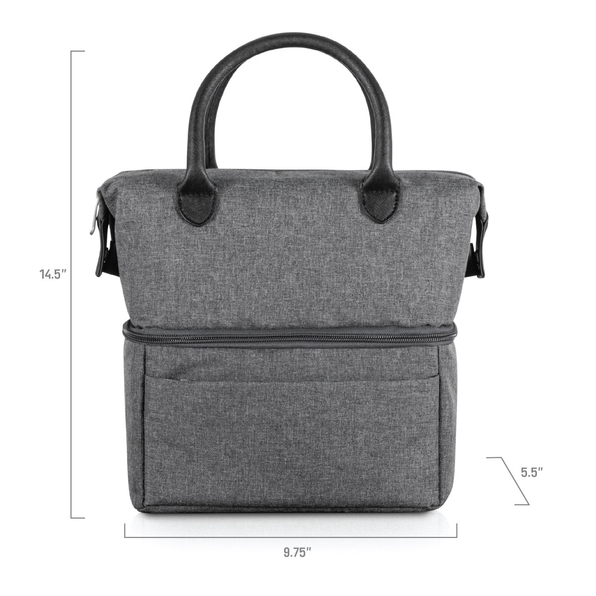 The Lunch Bag Cooler / Lunch Box is a soft cooler ideal for work, school, and small picnics. With an insulated work cooler on the bottom, a dry compartment up top and an additional front storage area to boot, theres plenty of space in this lunch tote. Two tiered lunch tote; Front flat zippered pocket leads to dry compartment for shelf items; Cooler on the bottom, made with wipeable materials; Leatherette handles and side snaps to increase compartment carry volume; 9.75” L x 5.5” W x 10.1”H