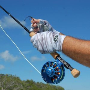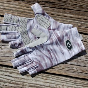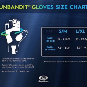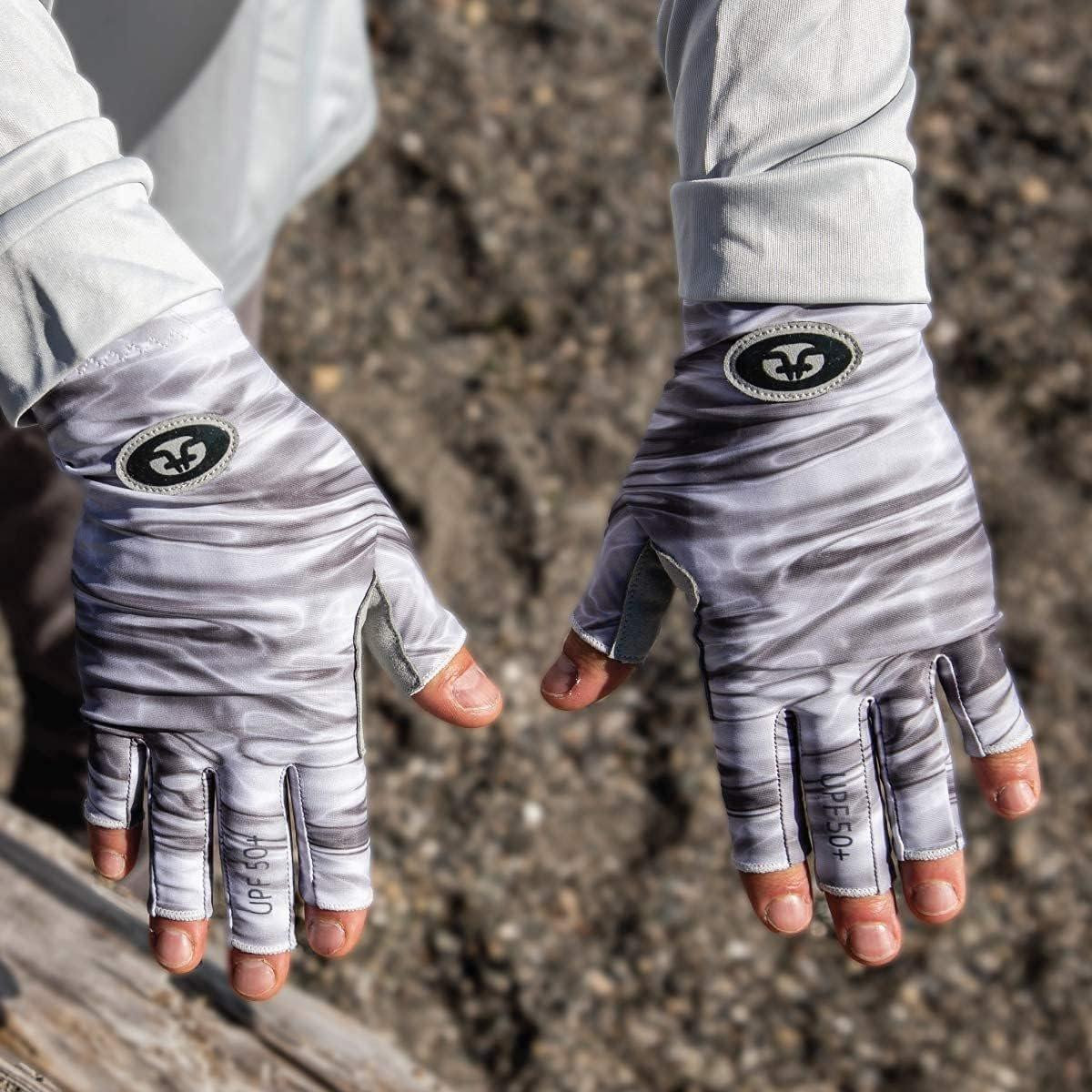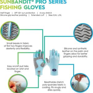 Flying Fisherman Sunbandit Pro Series Fishing Gloves have a half-finger design to improve flexibility and dexterity. Easy on-off wrist and finger pull tabs help to slip on fast when you need them and off when you dont. The silicone synthetic leather padding on palm and fingers add for a better grip and increased durability. Featuring an extended cuff and 50+ UPF protection from the suns harmful UV rays. Made of breathable, 4-way stretch poly-spandex fabric that fits snugly and dries quickly.
