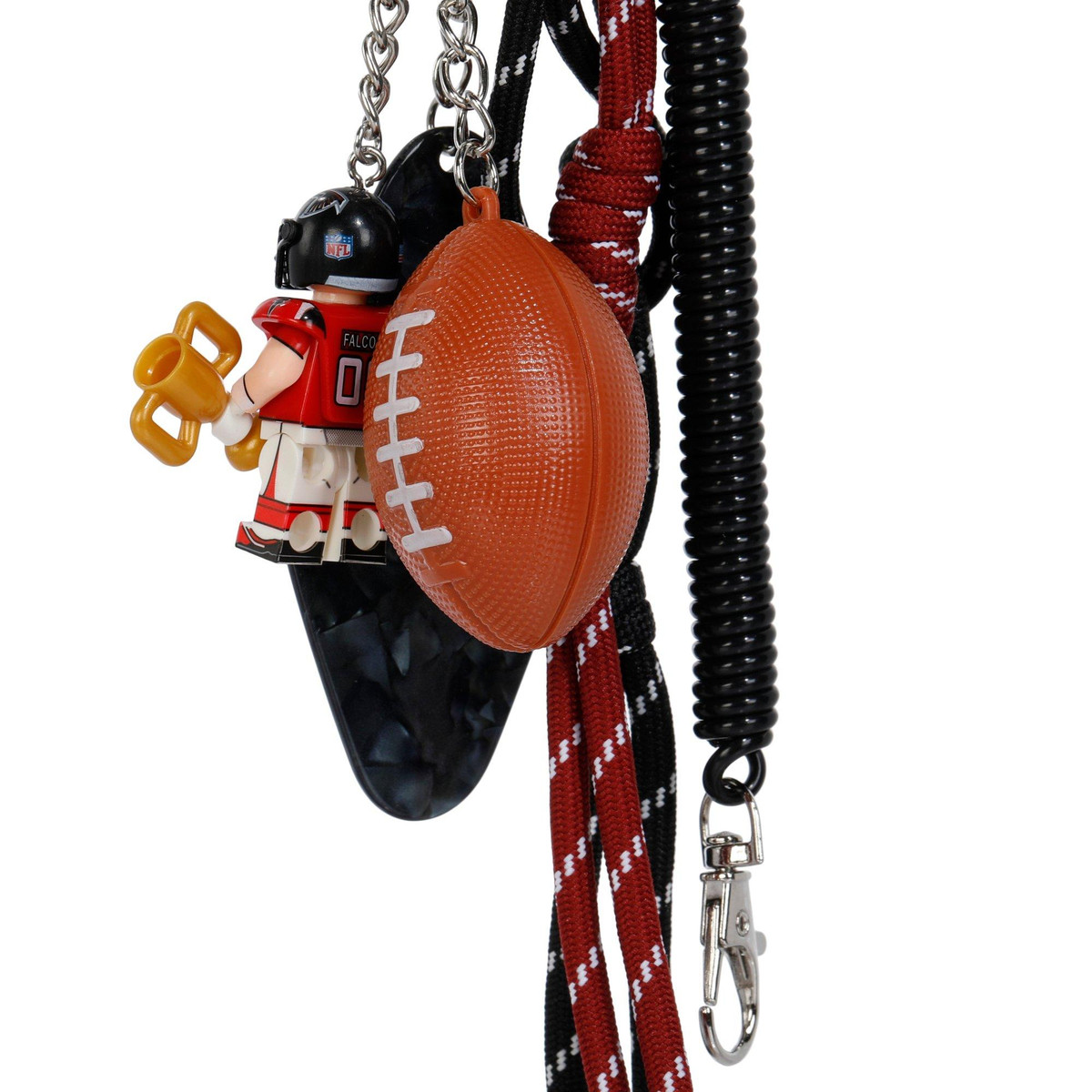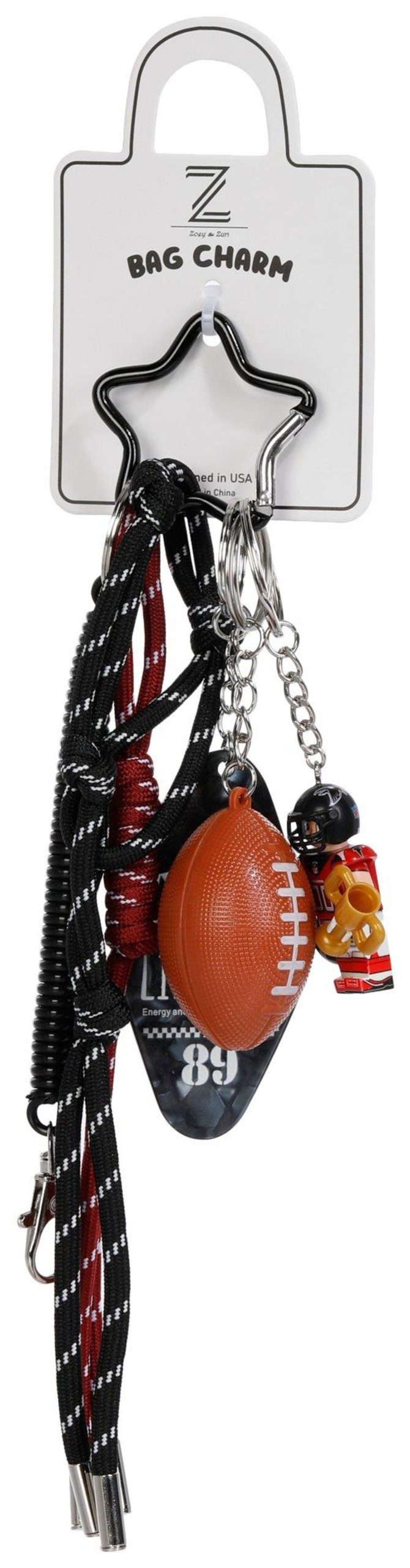 Bag charm set features a black football player Lego, garnet accent, football charm, and retro flair on a star-shaped carabiner. Designed in the USA, this pink and black combo adds sporty style to book bags, Bogg Bags, or any purse. A fun way to show off your personality with four unique charms and shoelace accents.