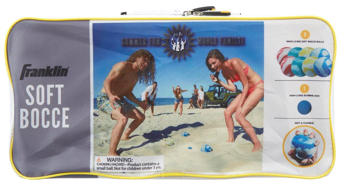The Franklin Sports 90mm Soft Bocce ball set is a classic outdoor game that will bring hours of fun for all ages. The set includes all you need for a day of fun: (6) all-weather 90mm soft molded PVC balls and (1) 40mm pallino scoring jack. The balls include (2) red, (2) blue, (2) yellow and (2) green colors so you can differentiate your players. Easily transportable, this versatile set can be used indoors or out due to the soft nature of the balls. All ages.