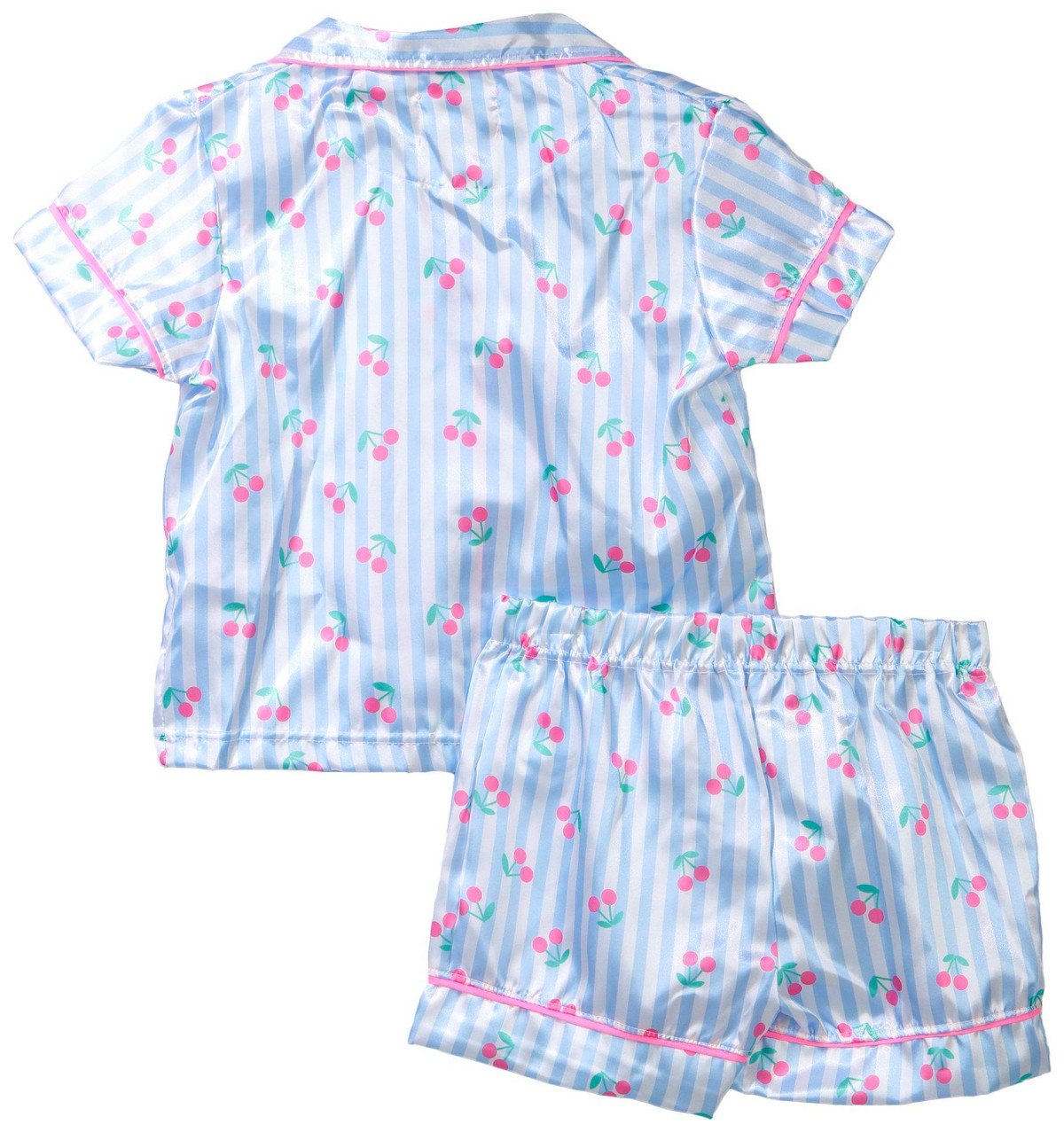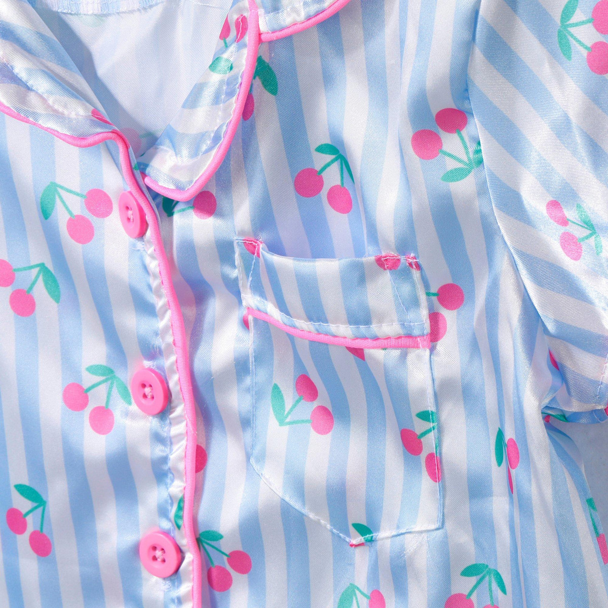 This big girls two-piece pajama set features a button-down collared shirt and matching shorts for a cozy fit. The blue striped design is adorned with a playful cherry pattern, while pink buttons and trim add a sweet touch. Made with flame-resistant fabric, it keeps her safe while she sleeps in style and comfort.