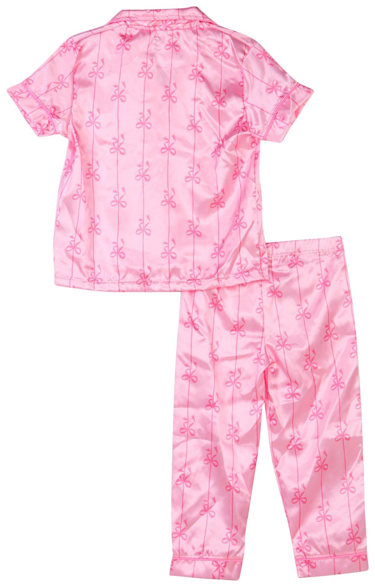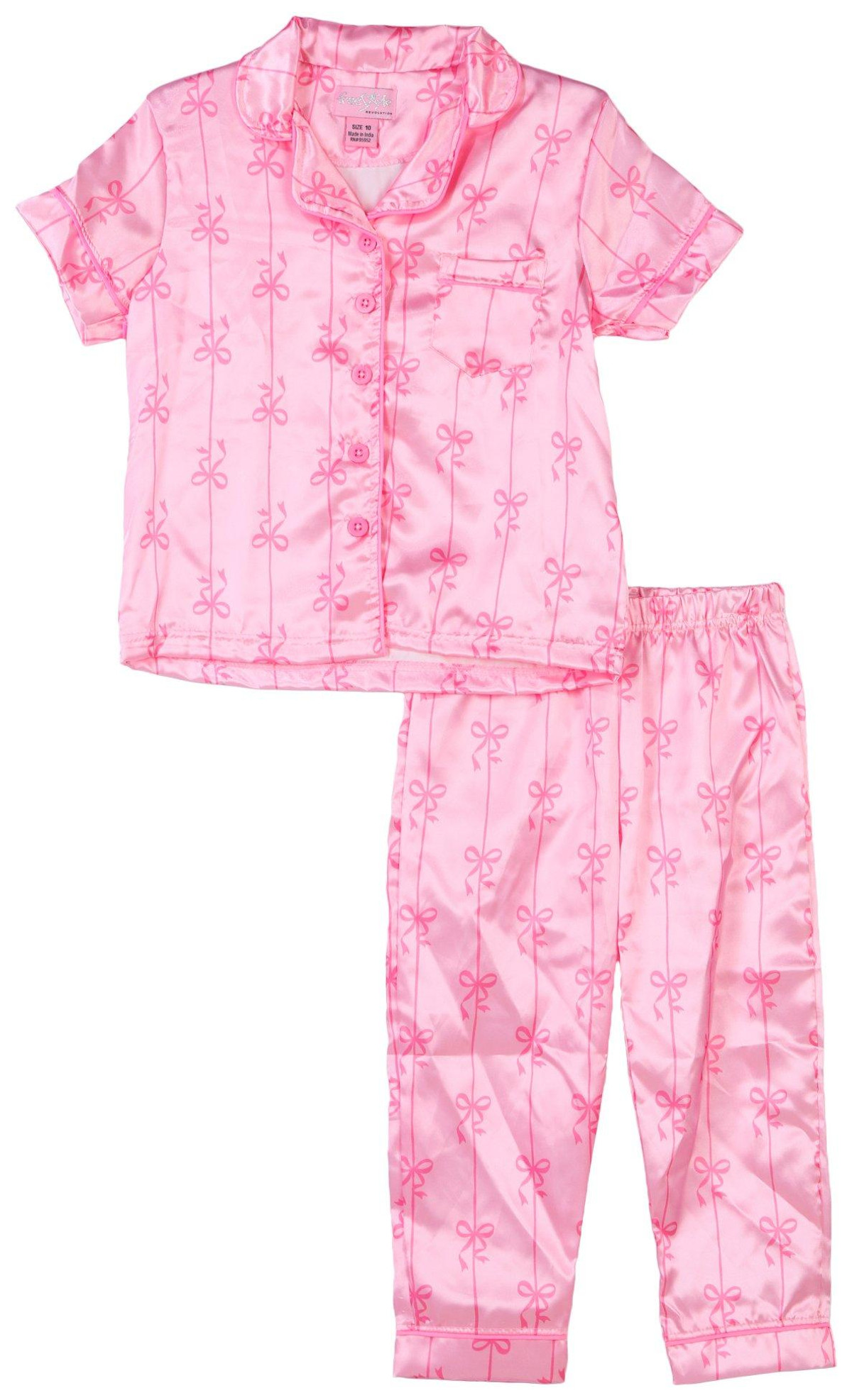 Pretty in pink, this two-piece pajama set adds a playful charm with its scattered bow design. The button-down top and matching pants offer a soft satin feel that makes bedtime extra cozy. Flame-resistant for peace of mind, this sleepwear is perfect for big girls who love a touch of sweetness in their nighttime style.