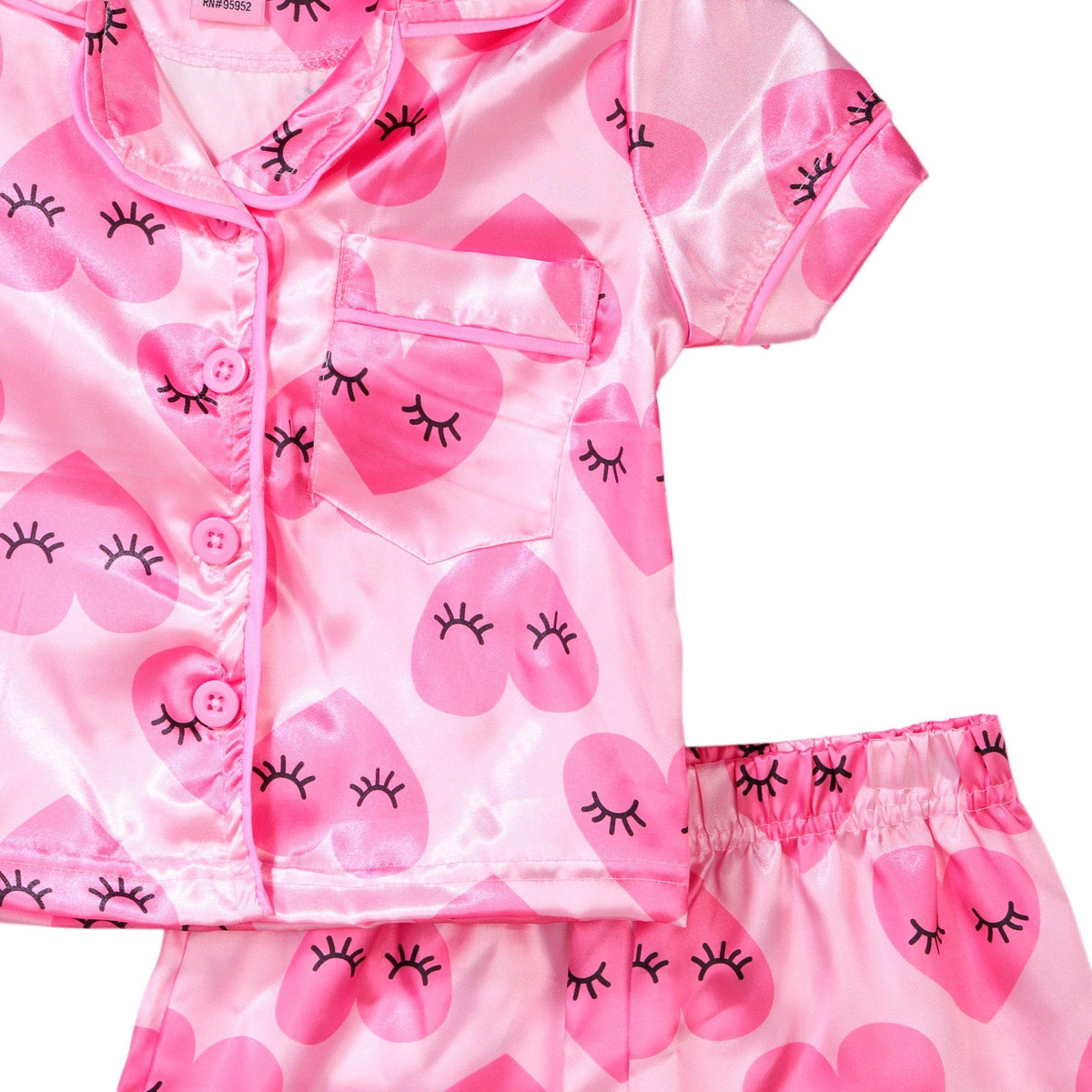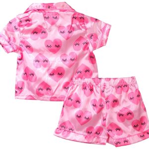 This little girls two-piece pajama set brings comfort and charm with a button-down collared shirt and matching shorts. Designed in soft pink with a heart and lashes pattern, it adds a sweet touch to bedtime. Made with flame-resistant fabric for safety, it is perfect for cozy nights and sweet dreams.