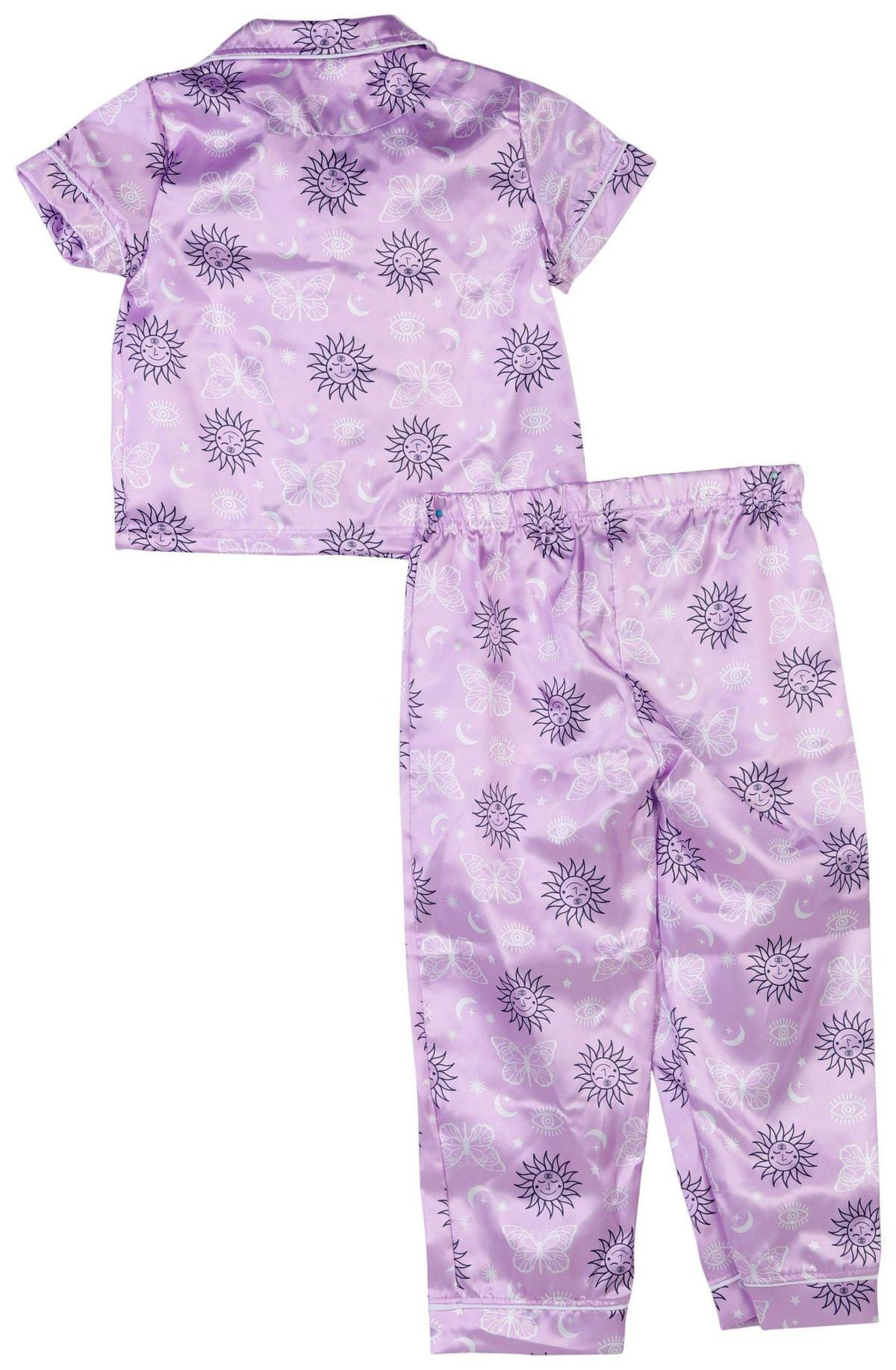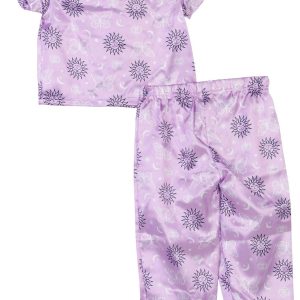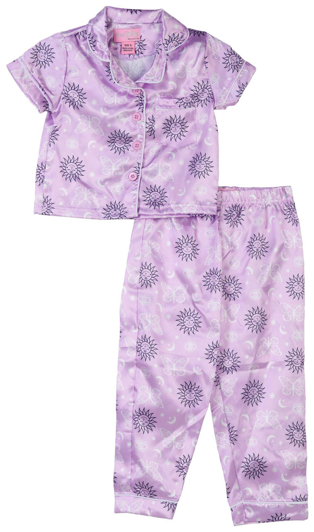 Celestial Satin is a purple two-piece pajama set that sparkles with a magical blend of sun butterflies and moon motifs. The silky button-down shirt and matching pants offer elegant comfort with a celestial vibe. Made from flame-resistant fabric, this dreamy sleepwear wraps big girls in cozy charm and galactic style.