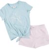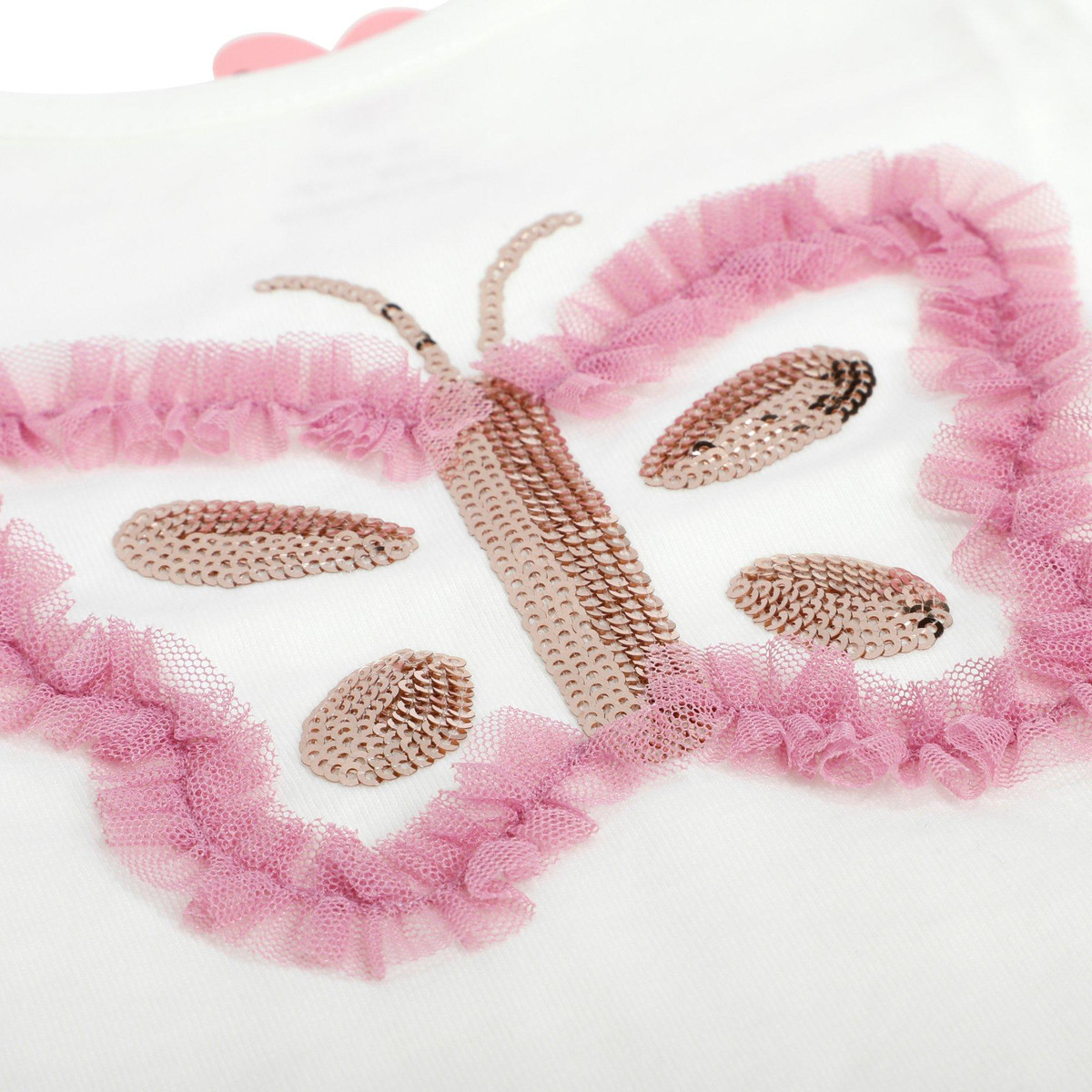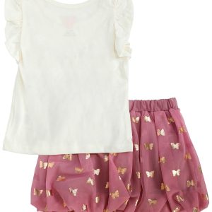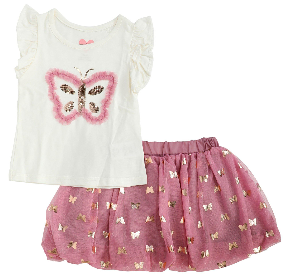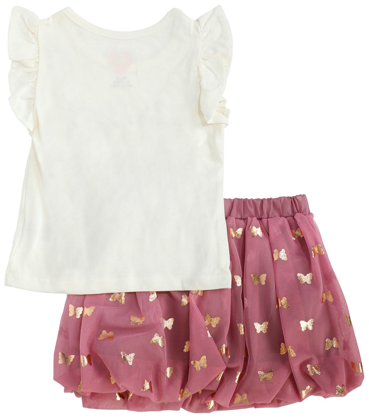 This toddler girls two piece butterfly bubble skirt set includes a short sleeve top with a charming butterfly design and a tulle bubble skirt featuring a foil butterfly pattern. Light and playful, it is perfect for twirling through sunny days and special occasions.