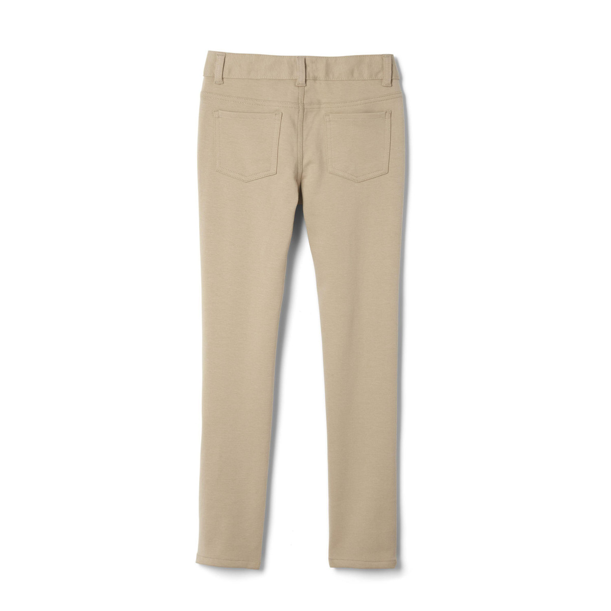 These pants feature a solid color design on soft stretch fabric, two front faux pockets, two functional back pockets, an adjustable waist, and a slim jegging fit.