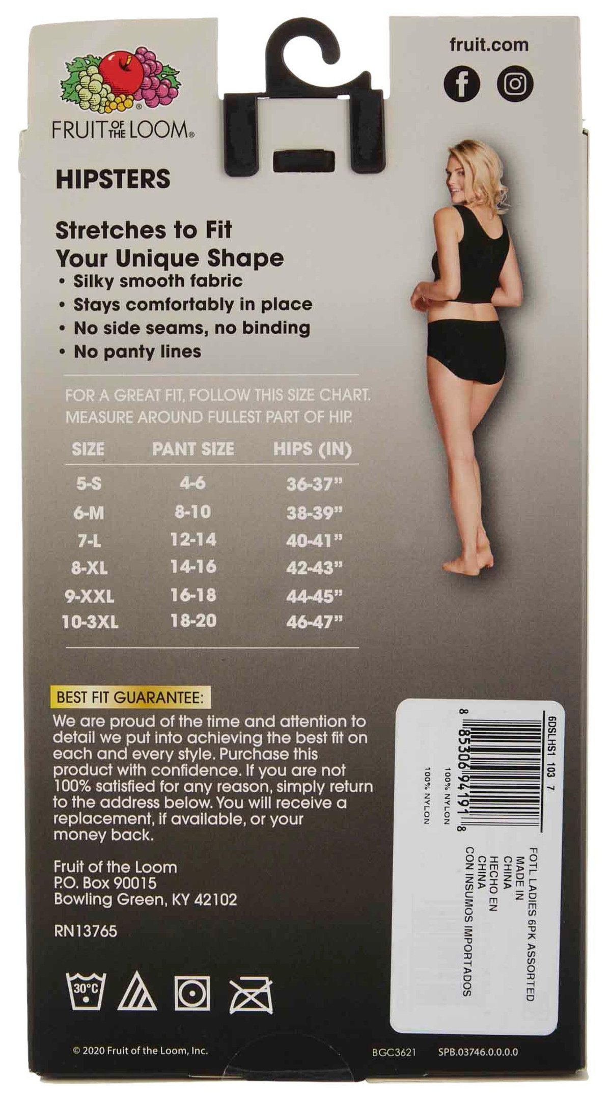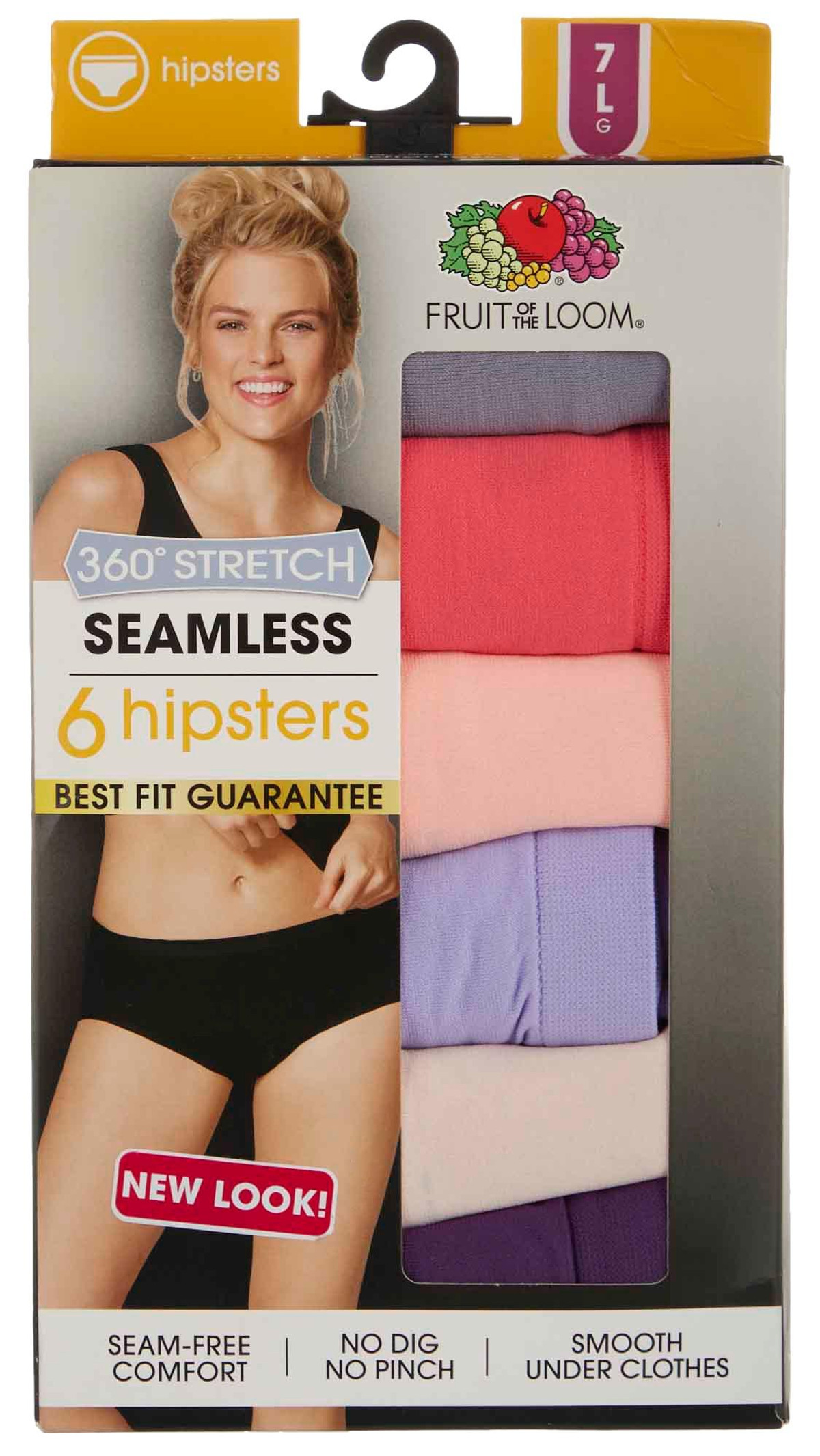 This Fruit of the Loom 6 pk. of seamless underwear features assorted solid-color designs on smooth seamless fabric, 360-degree stretch, and hipster styling. No panty lines. Fabrication 100% nylon.