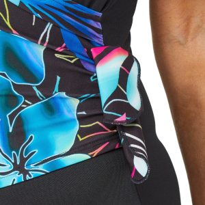 Escape to paradise in this surplice one piece swimsuit, featuring a vibrant tropical print and a flattering wrap-style front. Adjustable straps provide a perfect fit, while built-in sun protection keeps you covered in style. Its your go to for beach days, poolside lounging, and everything in between.