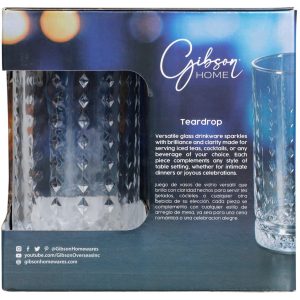 This 16 Ounce drinkware set from Gibson Home is designed with a teardrop shaped embossed exterior that sparkles with brilliance and clarity. Perfect for serving iced teas, cocktails, or any beverage of your choice, each piece complements any style of table setting. Whether you are celebrating with friends or enjoying a casual drink, this set will add a special touch to the occasion. Durable glass construction is dishwasher safe for easy cleanup.