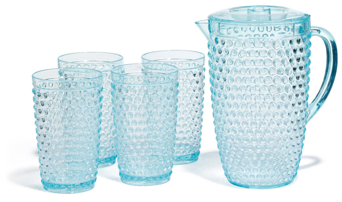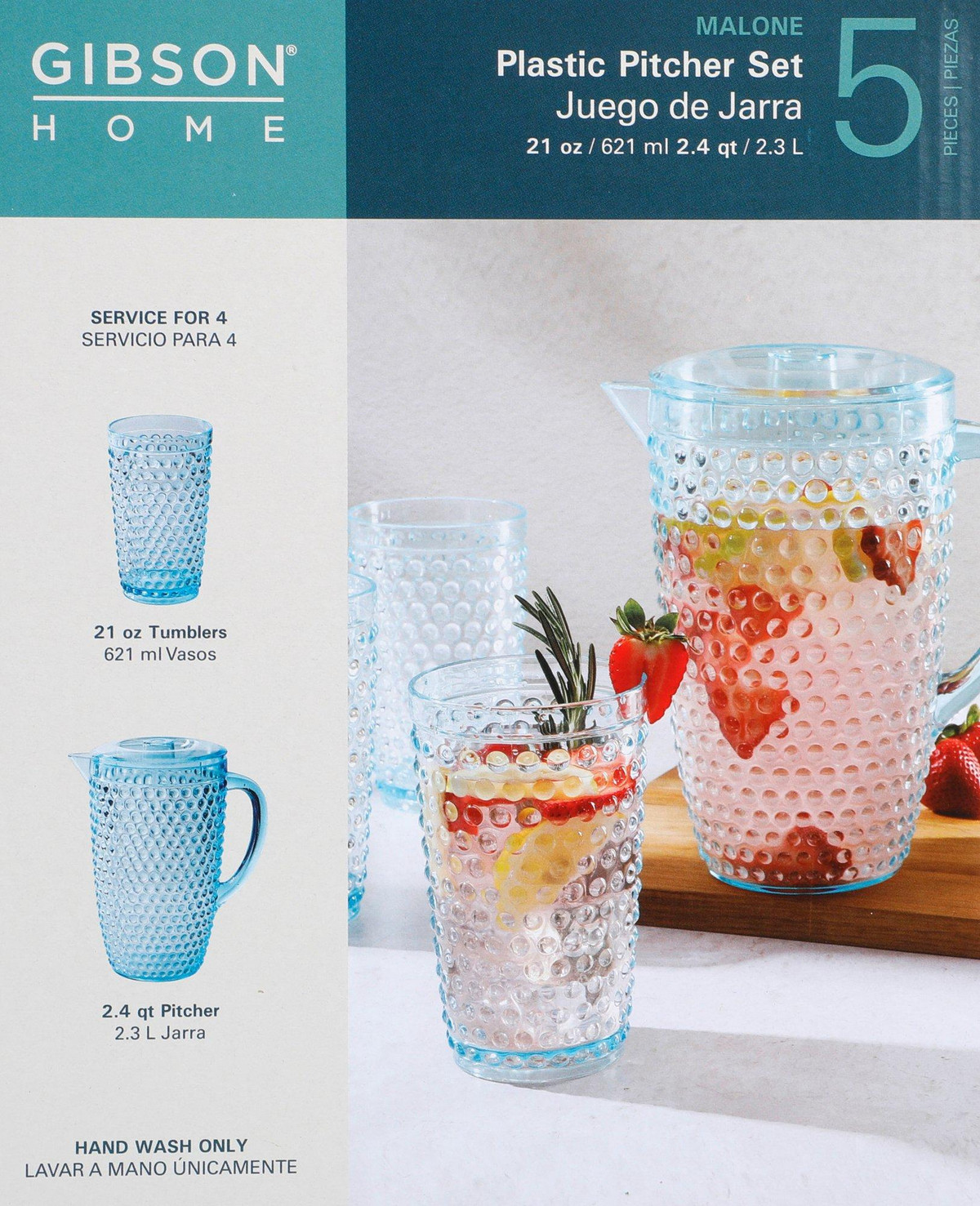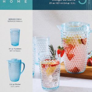 The Gibson Home 5 Pc Teal Embossed Pitcher Set is perfect for adding a touch of vintage charm to any table setting. The set comes with a pitcher and four matching drinking glasses. The embossed detail and vibrant sky-blue color create a beautiful and eye-catching appeal that will enhance any dining experience, whether it’s indoor or outdoor. It is made of a durable plastic that is easy to transport from the kitchen to the table.