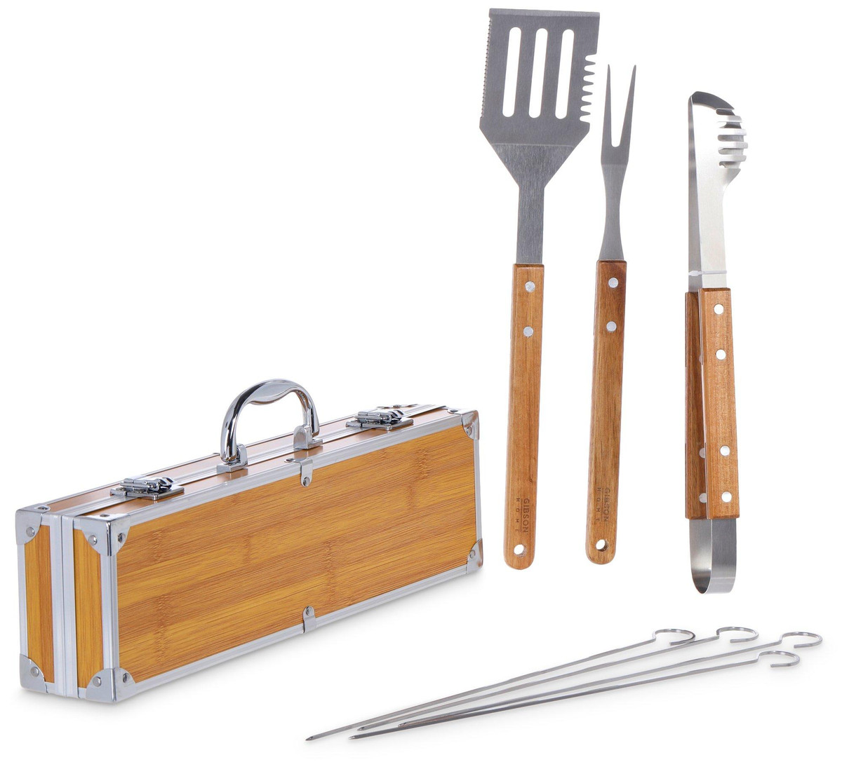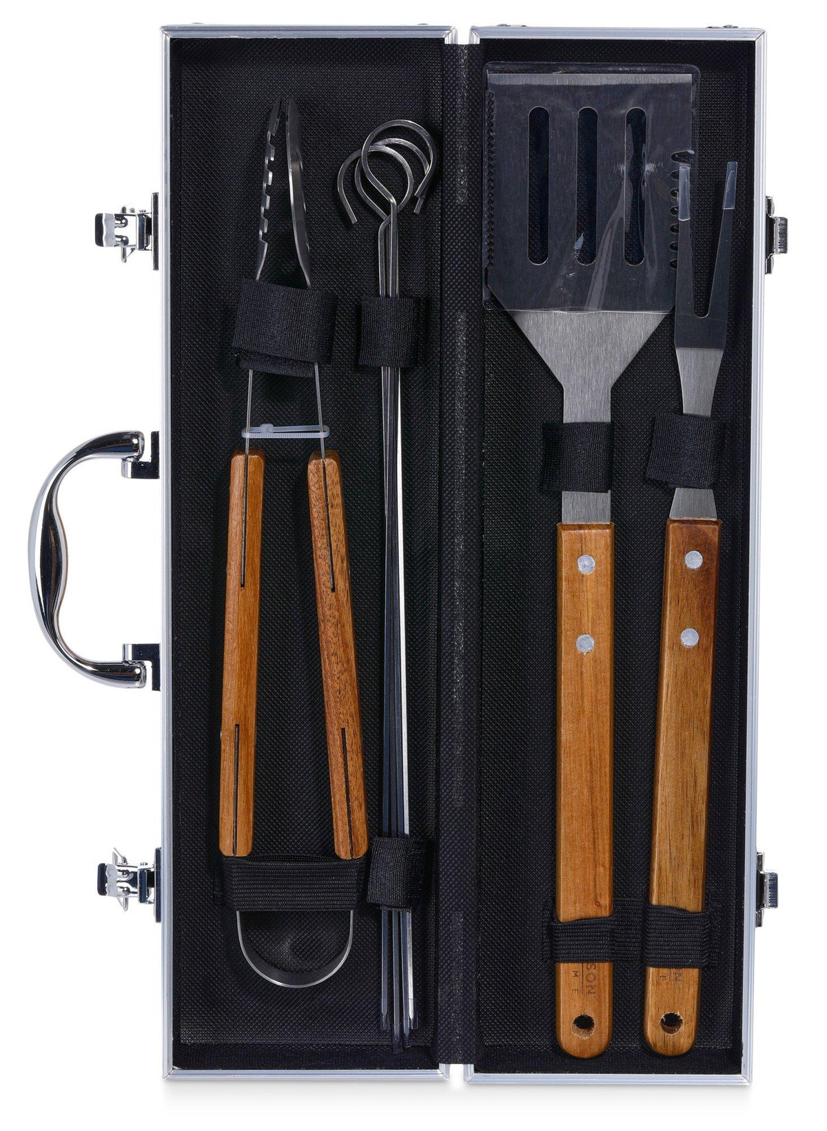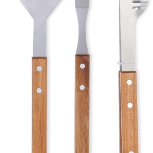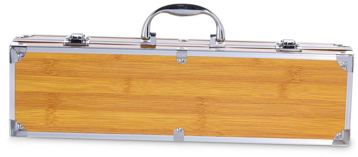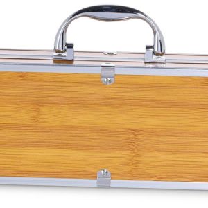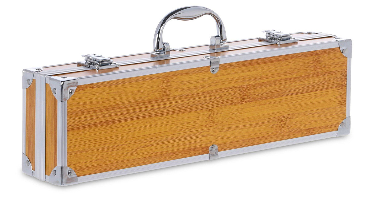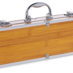 This 8 Pc Barbecue Tool Set features extra long stainless steel tools with acacia wood handles. Includes a beautiful aluminum carrying case, a spatula, tongs, fork and 4 skewers. Measures 17 in x 5.5 in x 3.5 in.