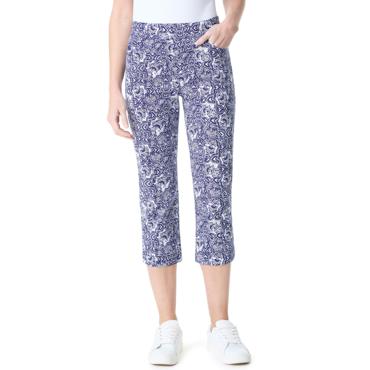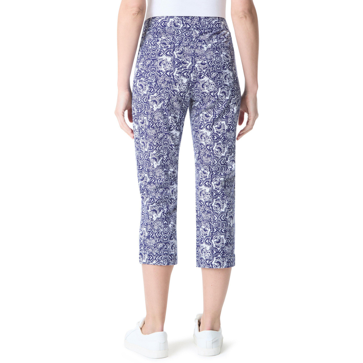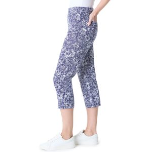 Brighten up your wardrobe with the Amanda Capris, featuring a playful print pattern and a classic 5-pocket design. Side hem splits add a touch of flair and ease of movement, while the flattering fit keeps you comfortable all day long. Perfect for adding personality to your everyday look, these capris are a stylish staple for sunny days. Fabrication is 98% cotton and 2% spandex. Inseam measures approximately 23 in.