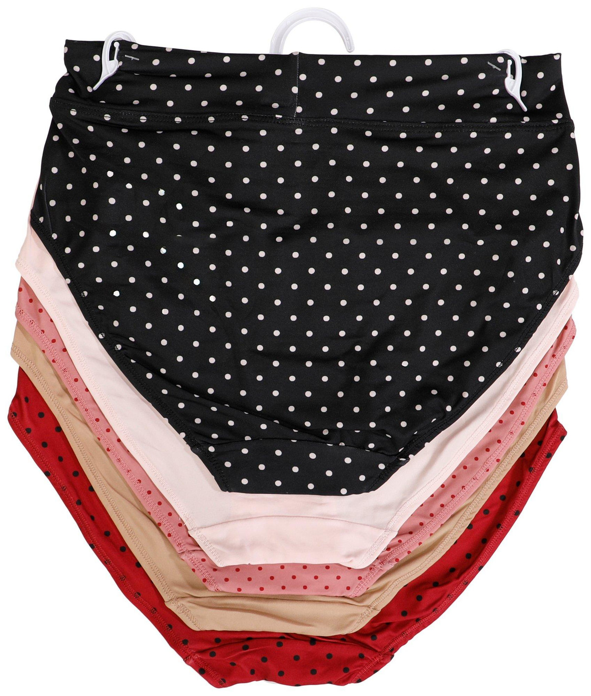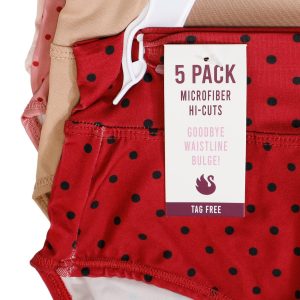 Enjoy smooth, comfortable coverage with the Womens 5 Pk Microfiber Hi Cut Panties. Featuring a mix of solid and polka dot designs, each pair is crafted from soft microfiber to reduce waistline bulge and offer a sleek fit under clothing. Ideal for everyday wear. Fabrication is 90% polyester, 10% spandex.