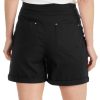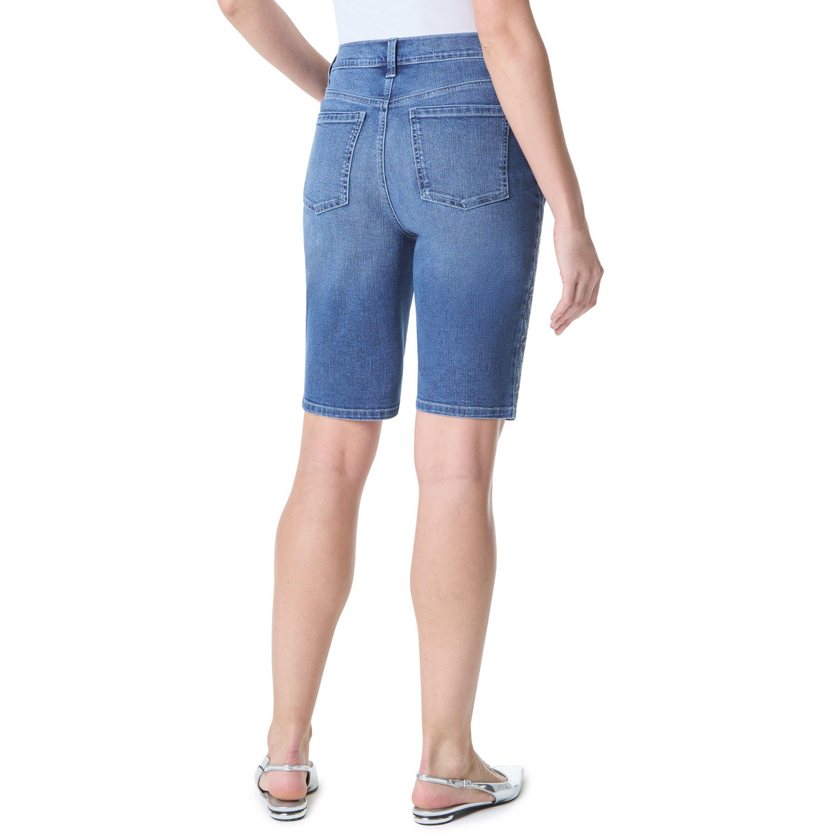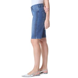 The Amanda Bermuda shorts feature a solid color design on lightweight denim fabric, zipper and one-button closure, five-pocket styling, and a classic fit. The inseam measures approximately 11 in. Fabrication is 59% cotton, 28% polyester, 12% viscose and 1% spandex.