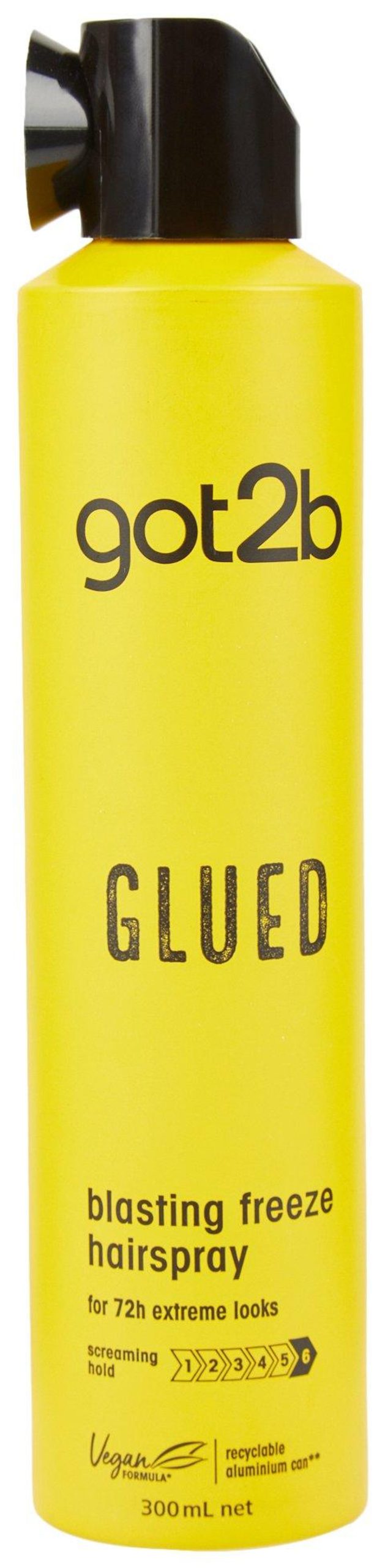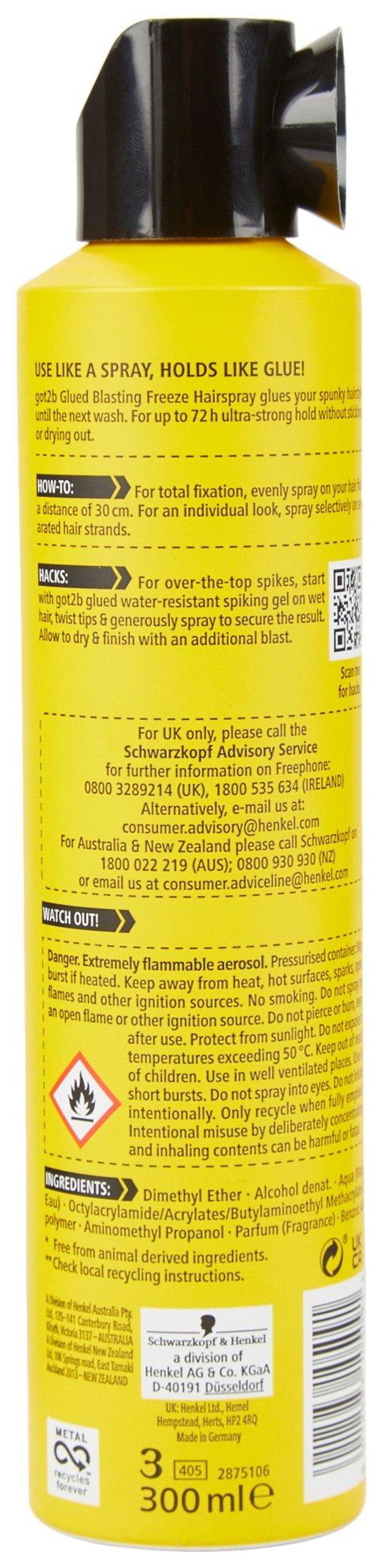 Get extreme hold that lasts with this Glued Blasting Freeze Hairspray. Perfect for high drama styles, spikes, or updos, this formula locks hair in place for 72 hours with no flaking. Water-resistant and humidity-proof. Contains 300 ml.