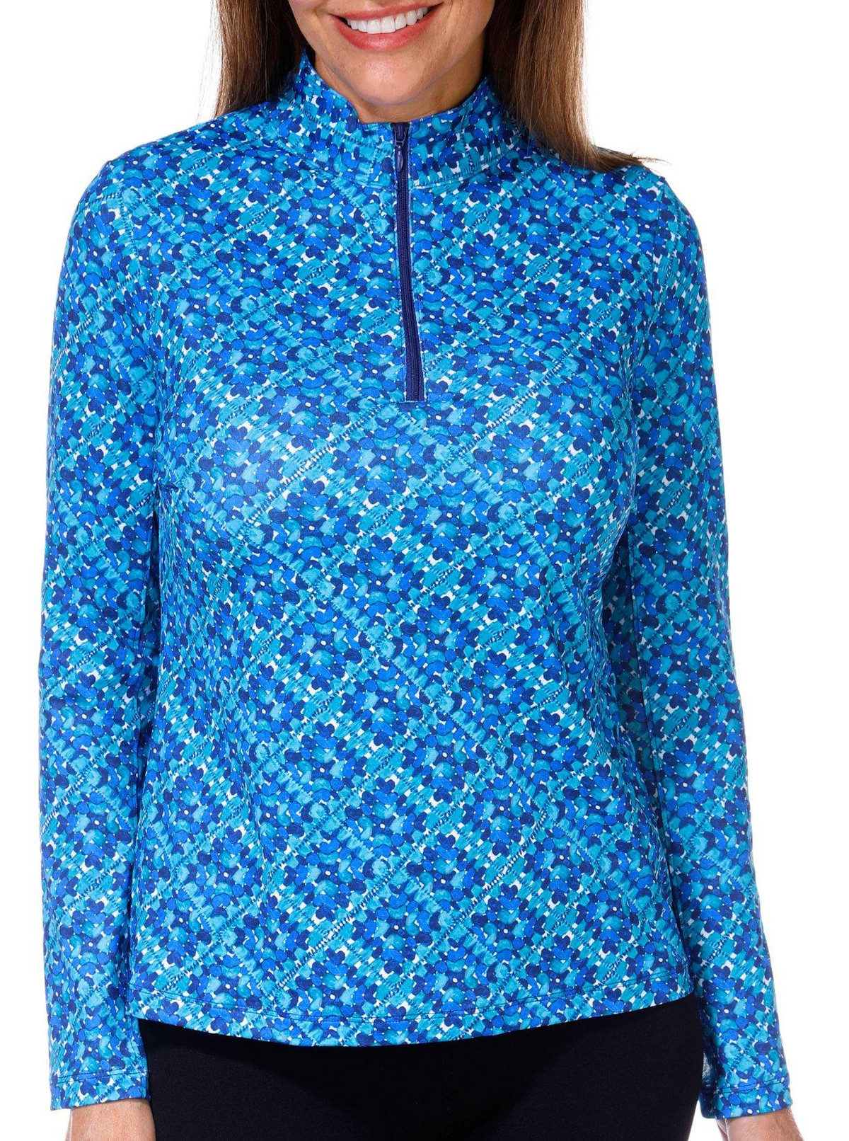This women’s active Kate mock top features a vibrant print with long sleeves and a zip placket neckline. Designed for performance it offers moisture wicking, quick dry, fabric flatlock stitching, and four way stretch for comfort and ease during any activity. Fabrication 88% polyester, 12% spandex