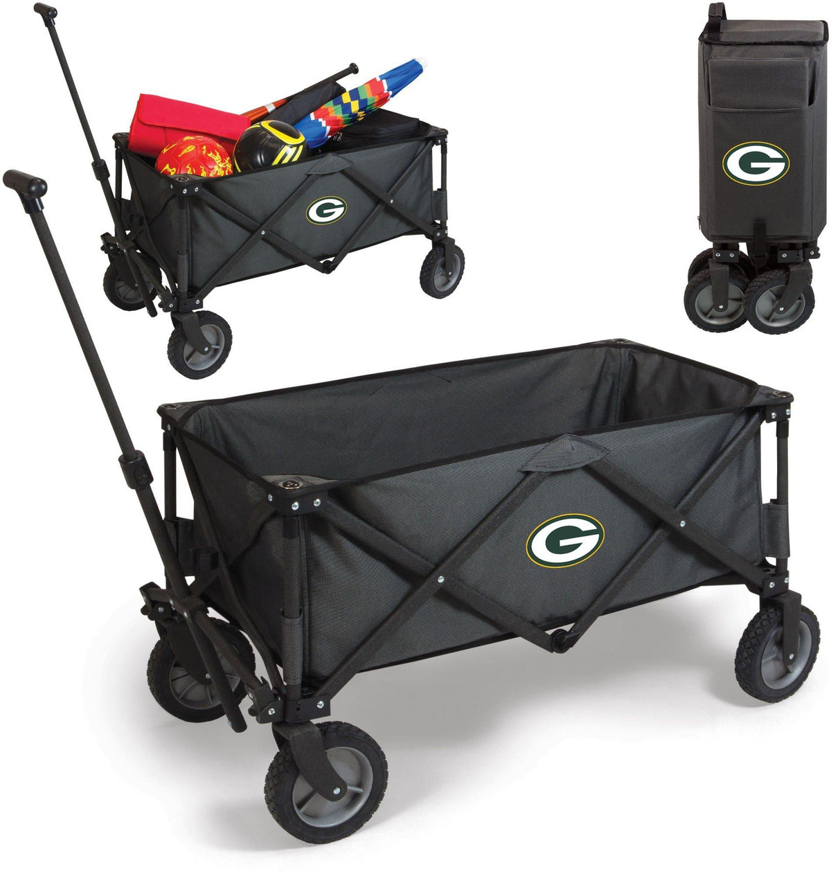 The Adventure Wagon is a utility wagon with heavy-duty wheels & telescopic handle that folds into a compact size and includes a fitted cover. Made of 600D polyester with a powder coated steel frame. Measures: 35.6” x 18.9” x 21.9” open, 10” x 11” x 30” closed.