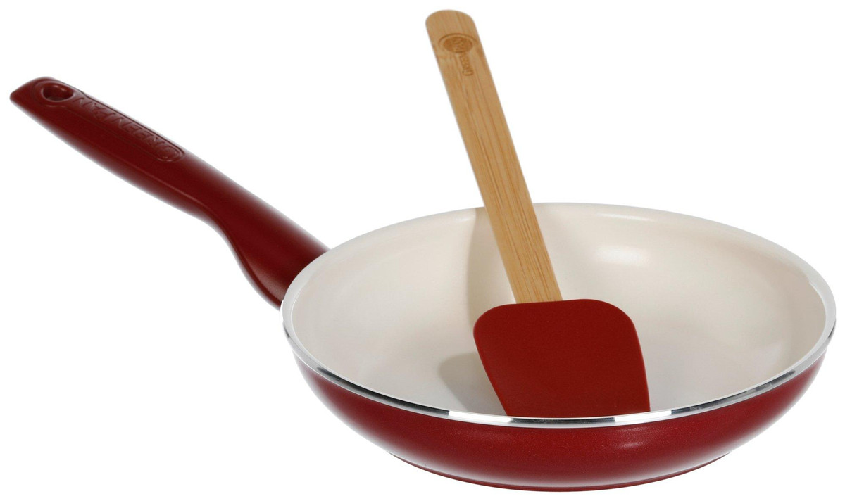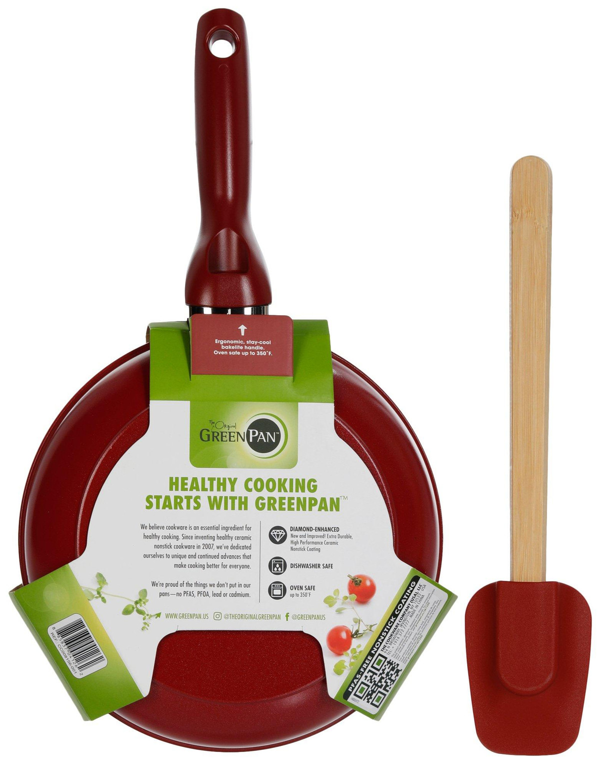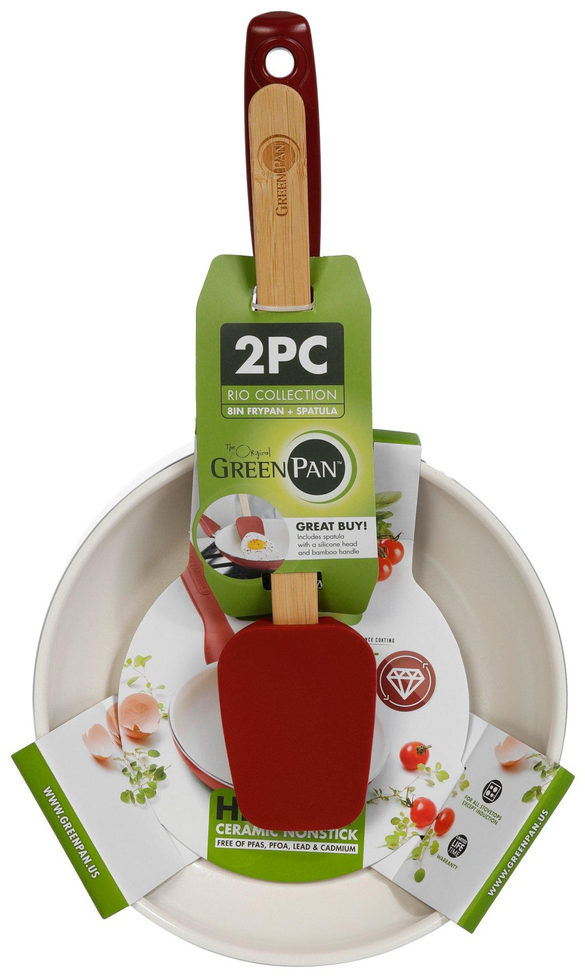 Elevate your everyday cooking with this versatile frypan set, perfect for scrambles, veggie sautés, and crispy fried fish. Featuring Thermolon healthy ceramic nonstick coating, these pans offer effortless food release and easy cleanupcompletely free of PFAS, PFOA, lead, and cadmium. The durable construction ensures even heat distribution, while the stay-cool handles provide a secure, comfortable grip on any stovetop. Includes spatula with a silicone head. Diameter measures approximately 8 in.