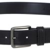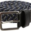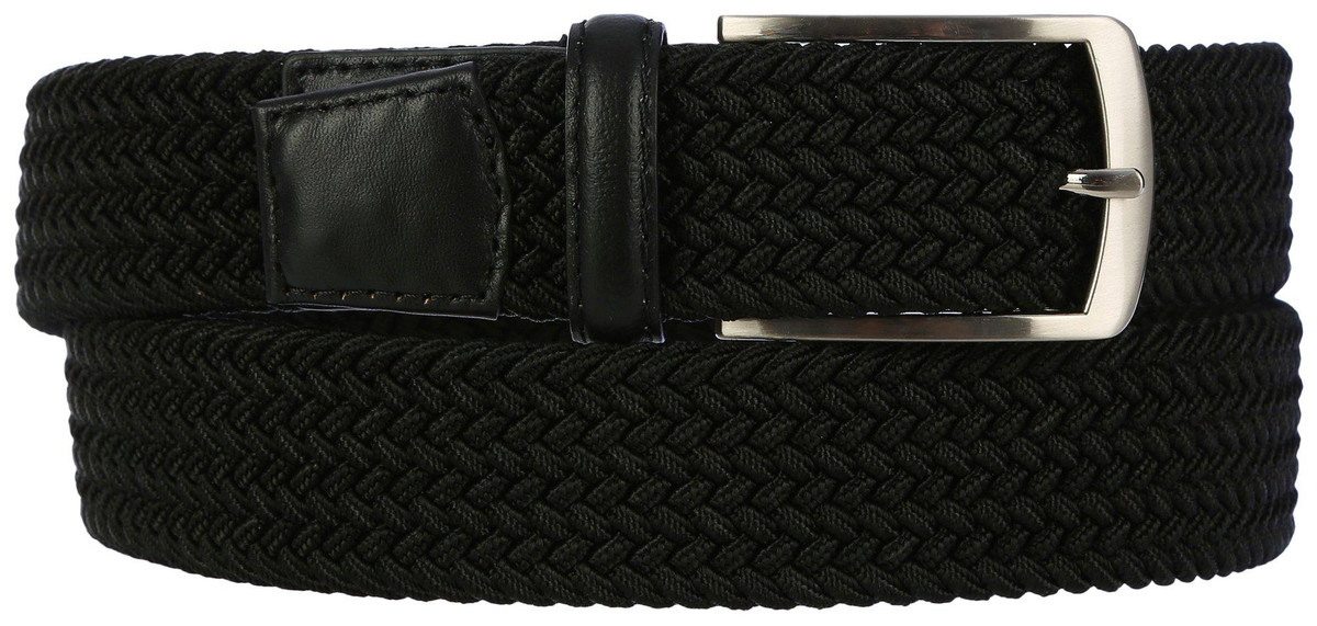 This Mens Belt features a solid color design on a woven stretch cord fabrication with a satin-sheen metal rectangle buckle and single prong. Belt measures approximately 33 mm wide.