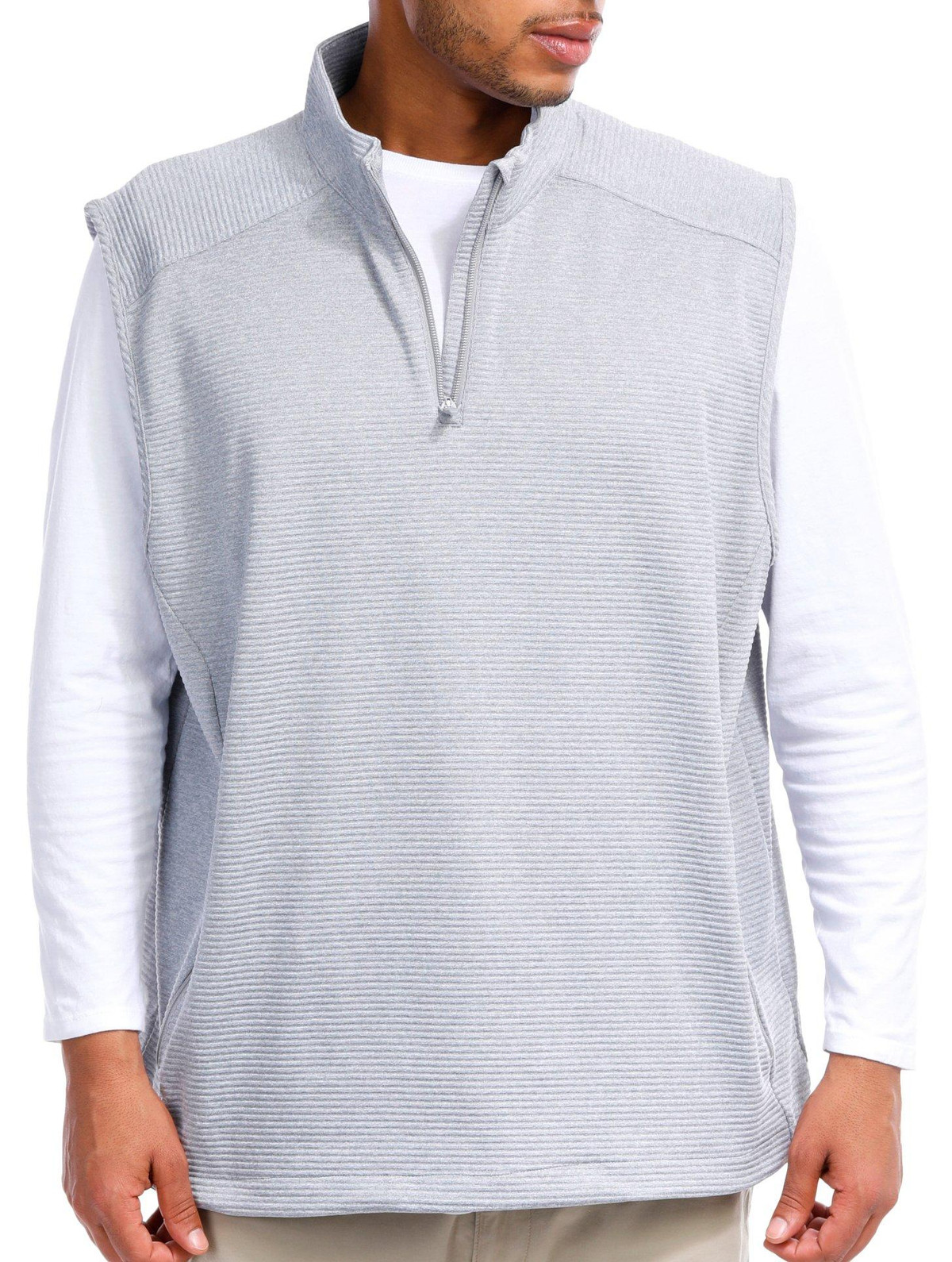 Stay stylish and comfortable with the Match Play 1/4 Zip Sleeveless Vest Jacket. Featuring double zipped front pockets for secure storage, this jacket is crafted from ribbed fabric for a sleek, textured look. The adjustable cinch waist allows for a customized fit, ensuring you stay comfortable during any activity. Perfect for layering, this versatile vest jacket is ideal for both casual outings and active adventures. Fabrication is 95% polyester, 5% spandex.