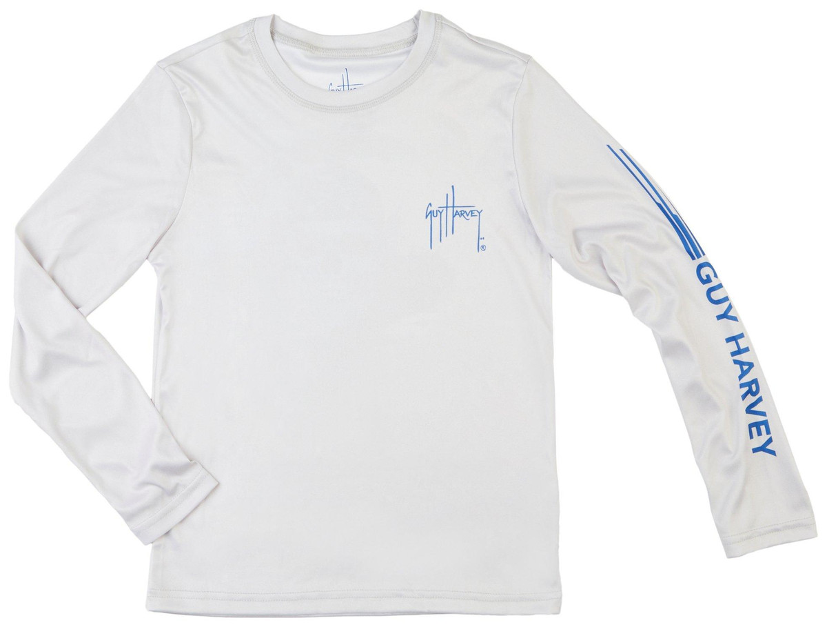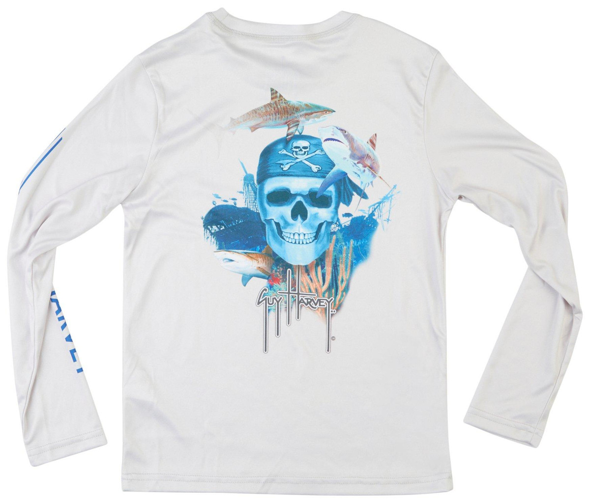 Combine performance and bold style with the Guy Harvey Big Boys Pirate Reef Long Sleeve T-Shirt, featuring a pirate skull and shark graphic on the back. Made from 100% polyester with UPF 30 sun protection, moisture-wicking properties, and stretch fabric. Ideal for fishing, beach days, and outdoor adventures.