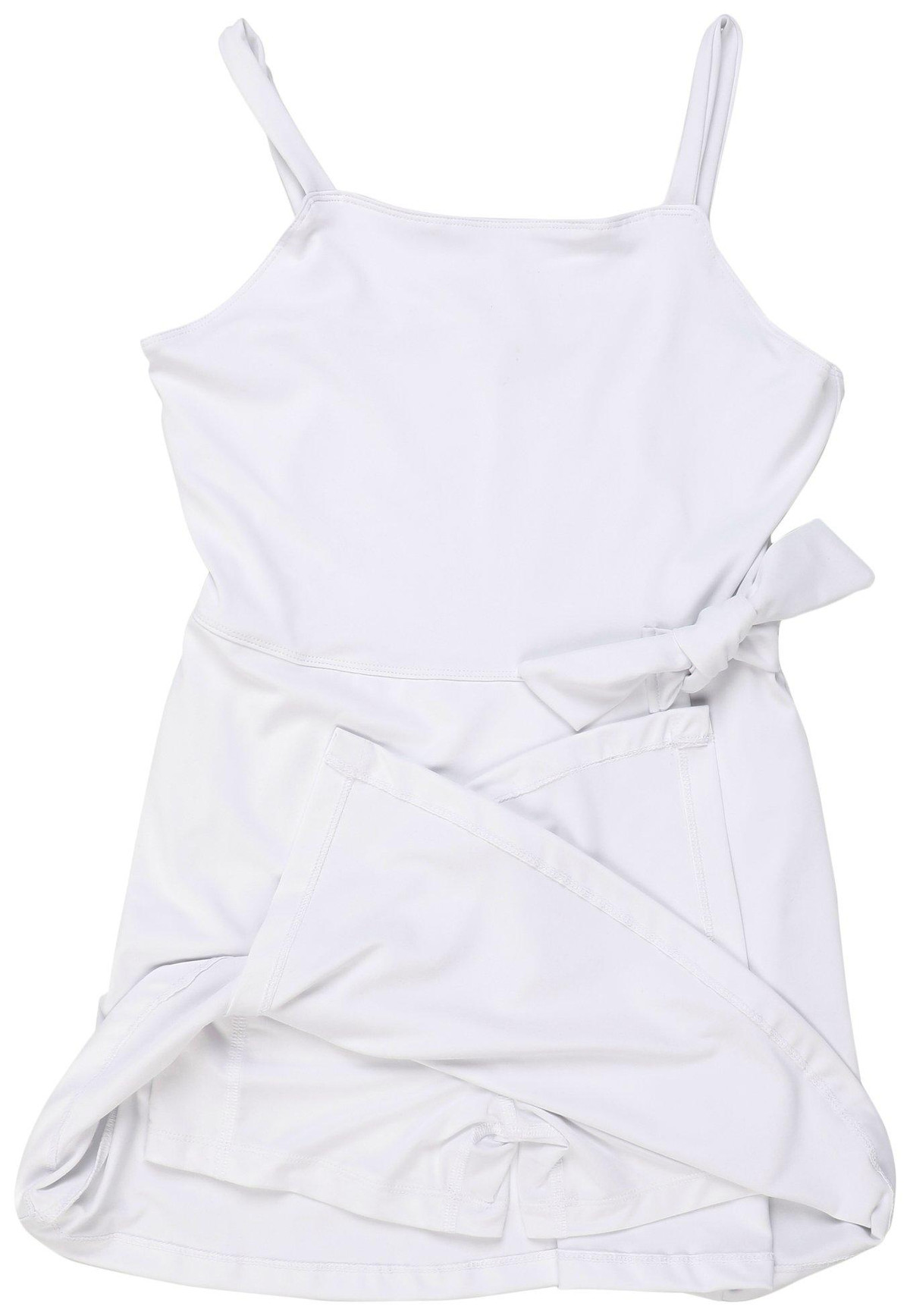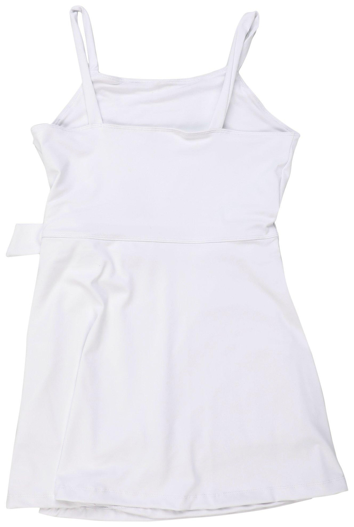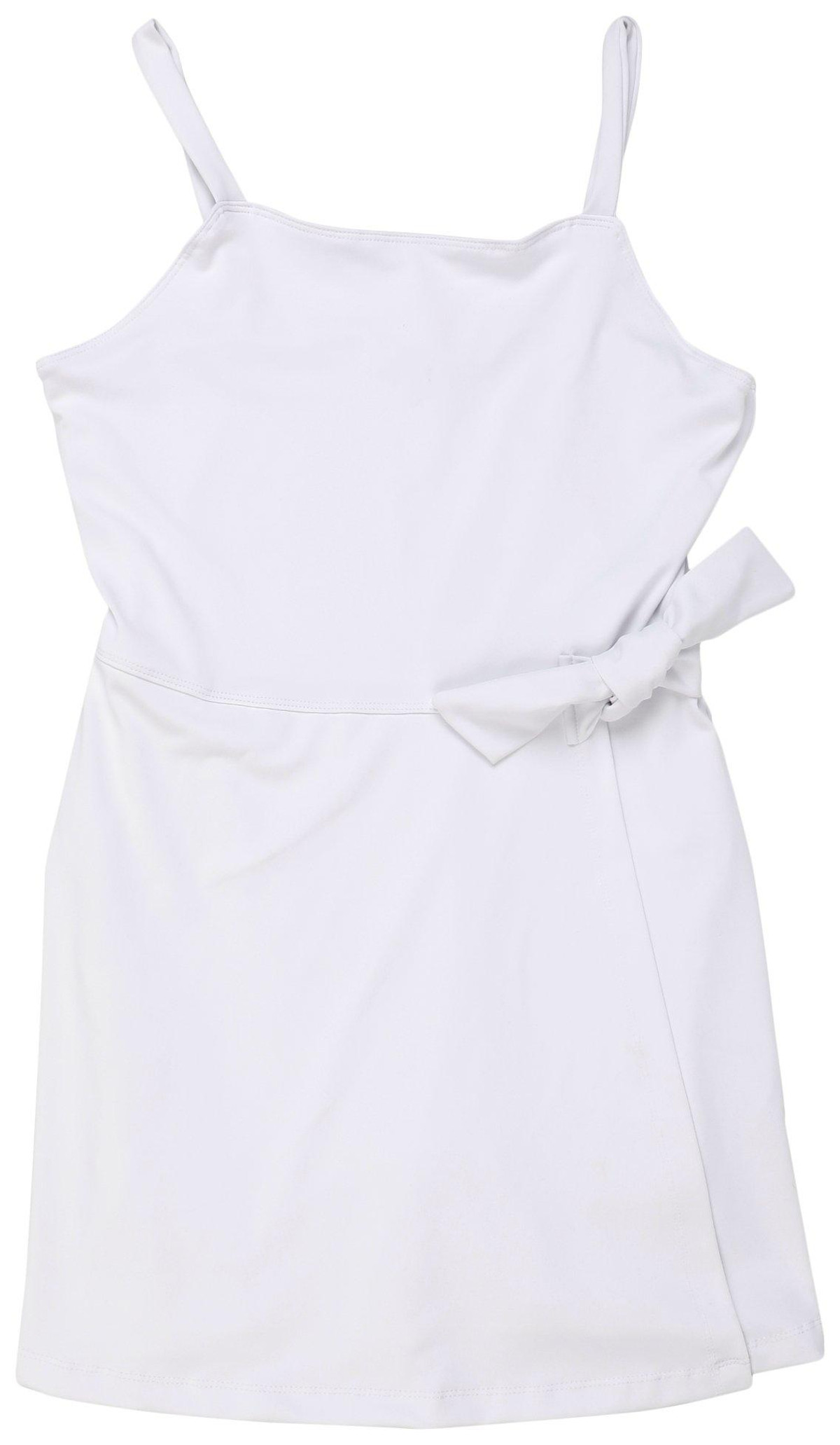 Watch her shine on and off the court in the Big Girls’ Sleeveless Tennis Dress with Skort. Designed with a stylish wrap skirt that adds graceful movement, its perfect for twirling and active play. Featuring a solid color design, charming side bow detail, and a fully lined skort, this dress blends elegance and function, ideal for tennis matches or special occasions. Fabrication is: Body – 87% polyester, 13% elastane; Skort – 92% polyester, 8% elastane. Dress length measures approximately 31 in.