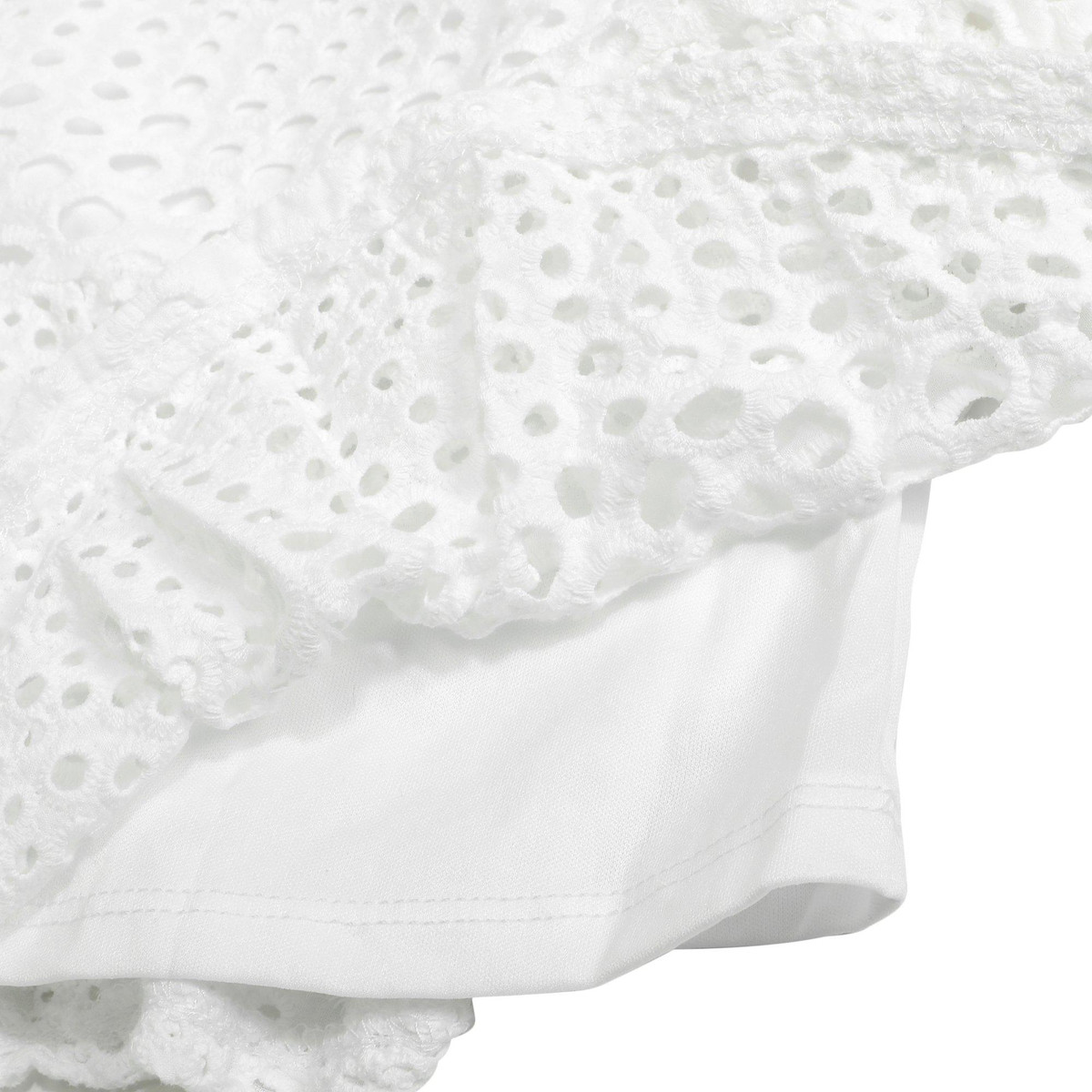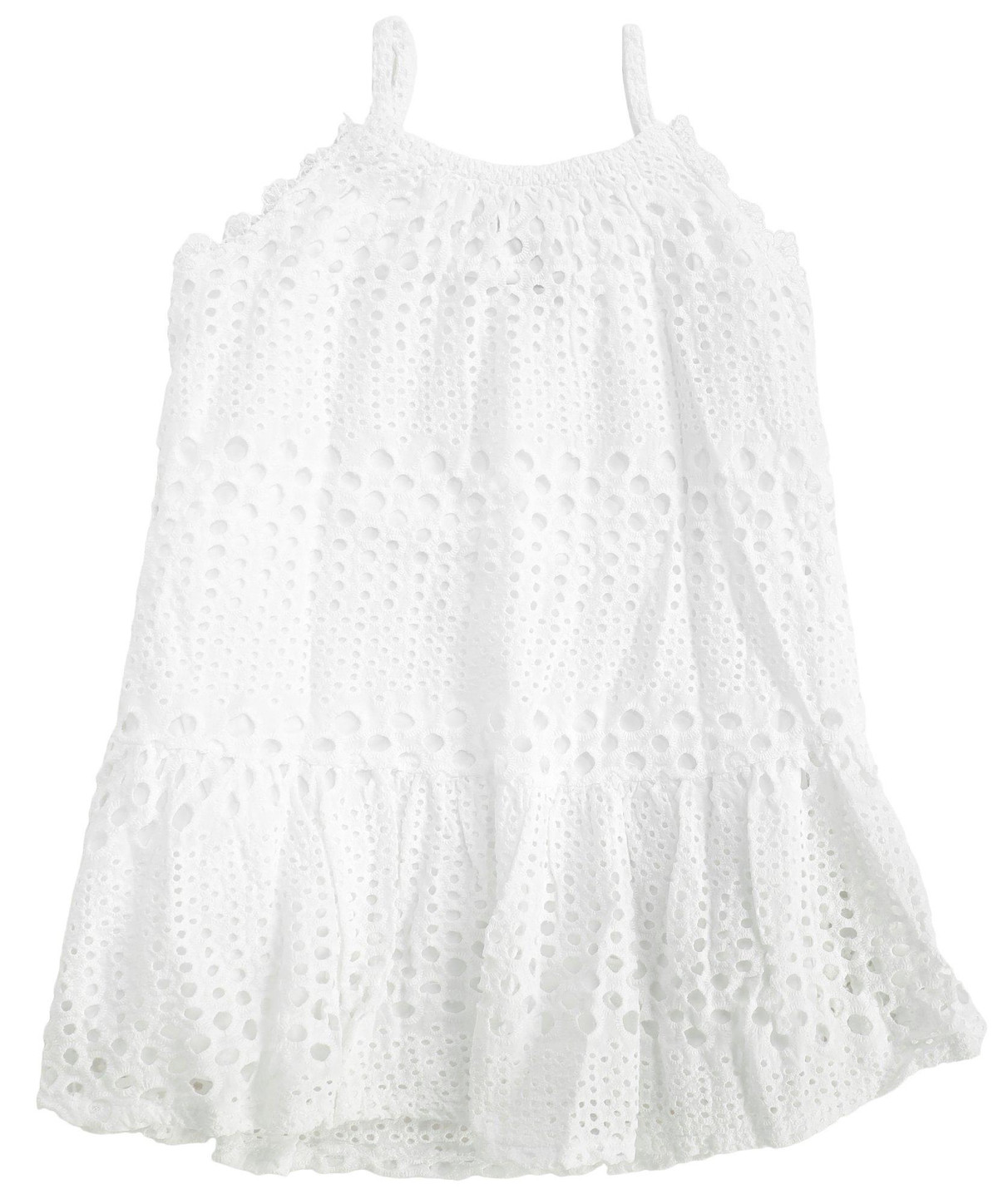 This toddler girls sleeveless eyelet dress features a solid eyelet exterior with delicate lace trims on the arms. Its classic design and lightweight fabric make it a charming choice for warm weather and special occasions.