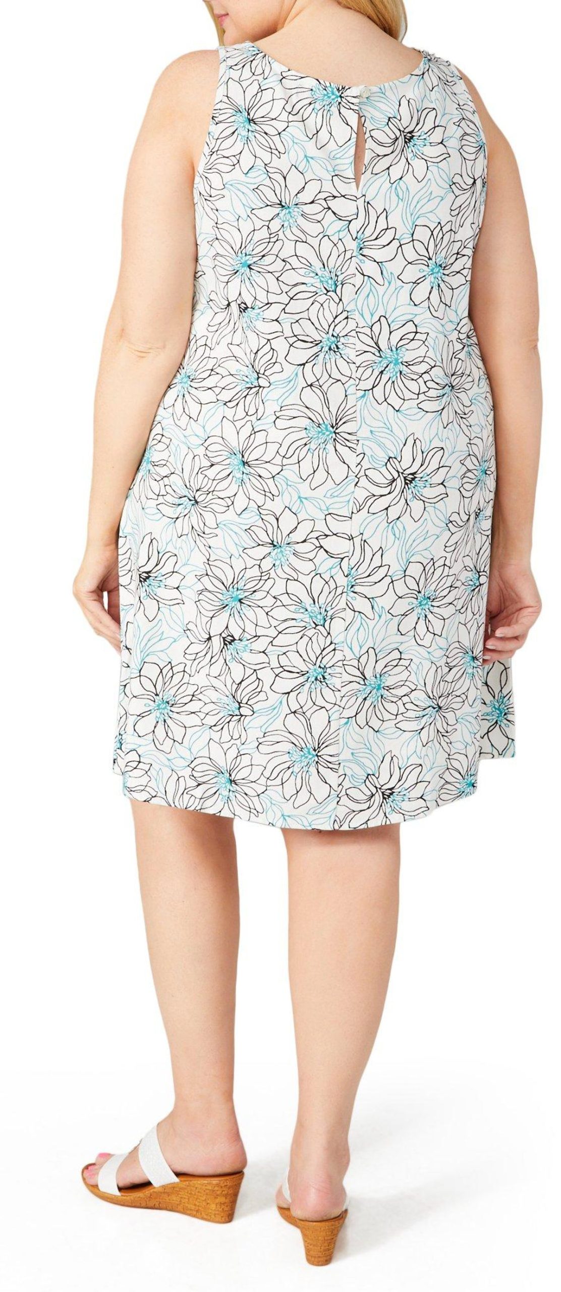 Make a statement with this Sleeveless Sheath Dress. Featuring a knee-length design and an eye-catching abstract floral print, this dress is perfect for any occasion. The sleek silhouette offers a flattering fit, while the sleeveless style ensures comfort and ease. Whether you’re attending a formal event or a casual outing, this dress provides a blend of sophistication and modern flair that will make you feel confident and chic. Fabrication is 91% rayon, 8% linen, 1% other fibers.