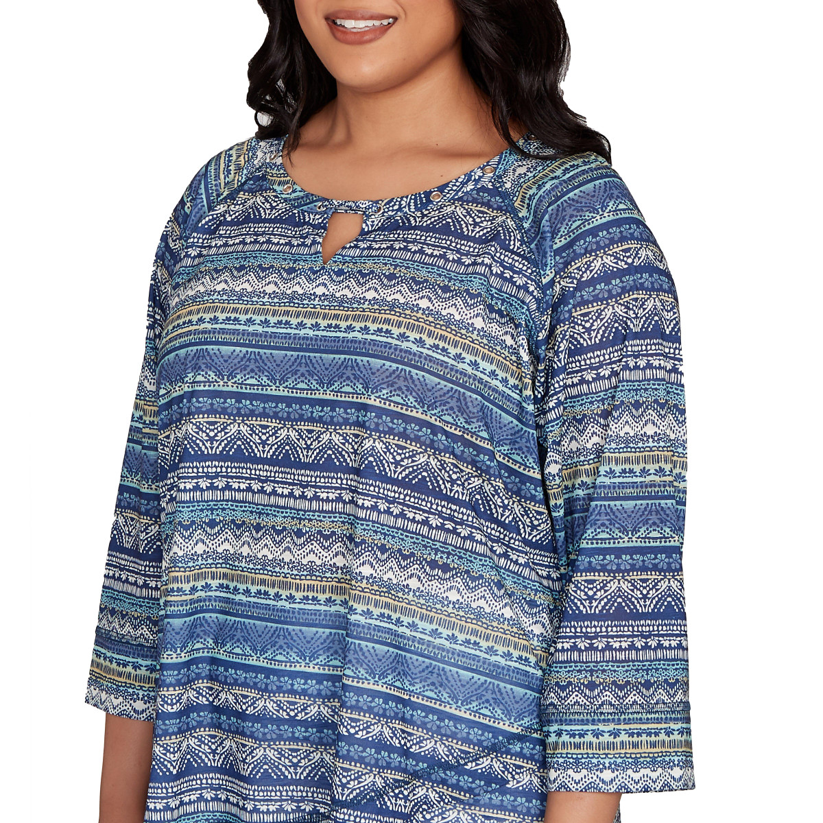Add a touch of sparkle to your style with this Hearts Of Palm tulip hem slub top. Featuring a delicate neckline embellishment, 3/4 sleeves, and a flattering printed design, this soft, lightweight piece offers effortless elegance and everyday comfort. The top length measures 28 in. Fabrication 100% polyester.