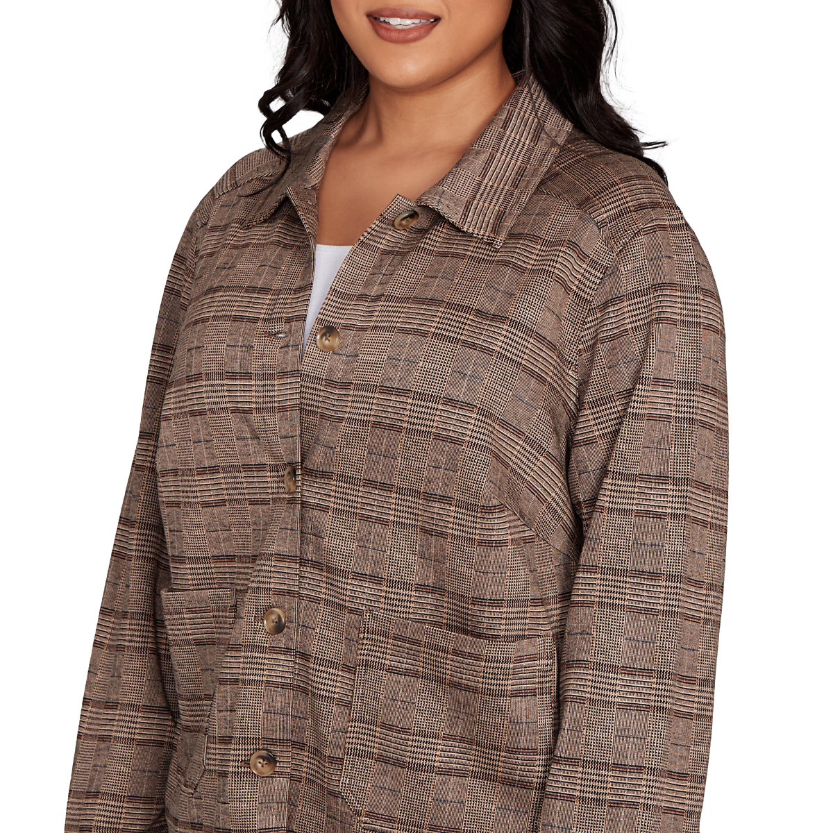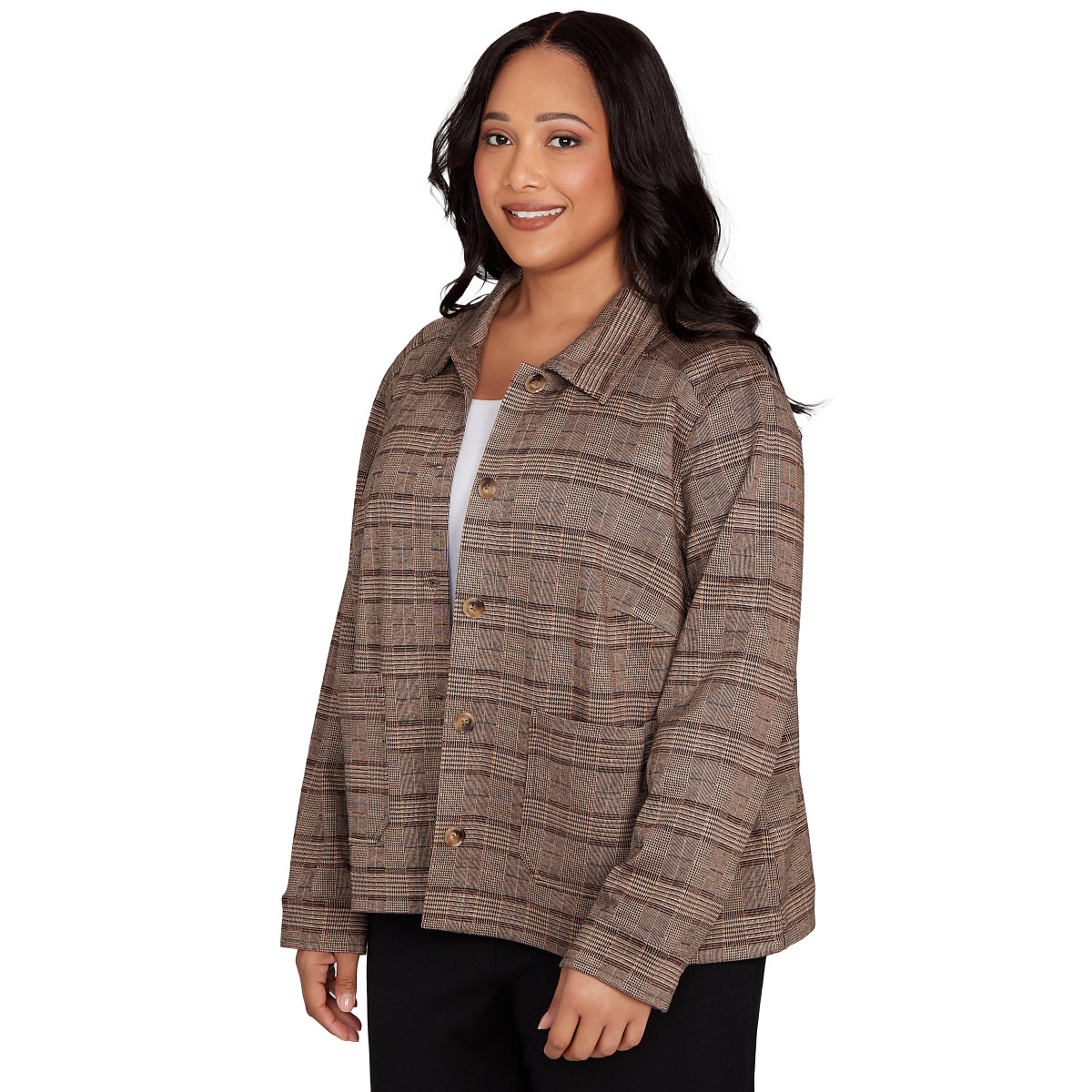 Embrace cozy fall style with this Hearts Of Palm plaid jacket. Featuring long sleeves, button-down styling, two front pockets, and a spread collar, this versatile layer blends comfort and polish. Perfect for workdays or weekend outings. The jacket length measures 26 in. Fabrication 75% viscose, 22% polyester, 3% spandex.
