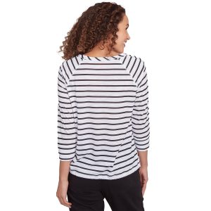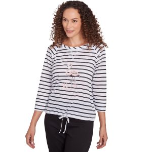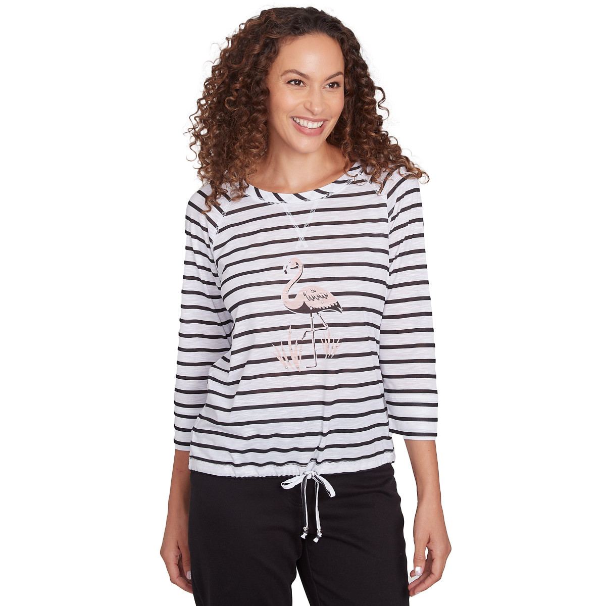 Embrace your inner fashionista with this statement-making Womens Hearts of Pam In Black & White tee. The bold flamingo print and eye-catching striped pattern instantly elevate any outfit, while the soft, drapey fabric and 3/4 sleeves create a figure-flattering silhouette.