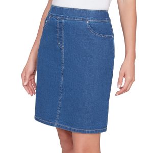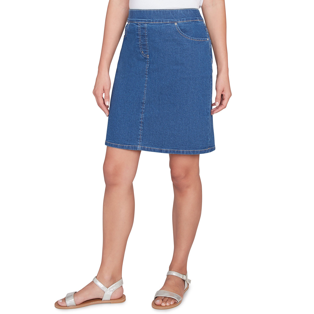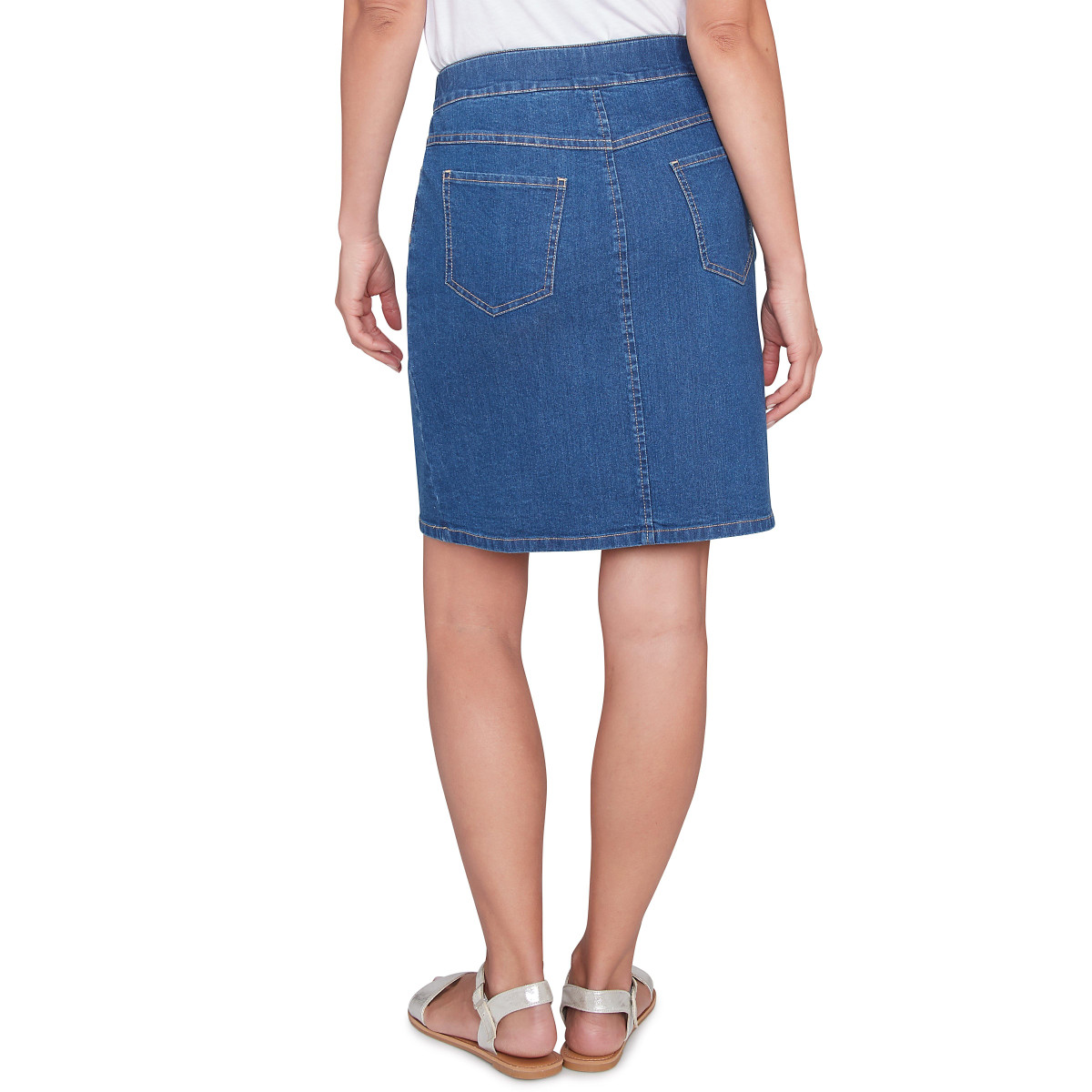 Slip into this Womens Hearts of Palm Anchors Away indigo stretch denim skirt and experience everyday elegance. The pull-on waistband offers easy, on-the-go convenience, while the stretchy denim fabric conforms to your curves for a flawless, figure-flattering fit. Features faux fly, stretchy denim fabric and pull on waistband.