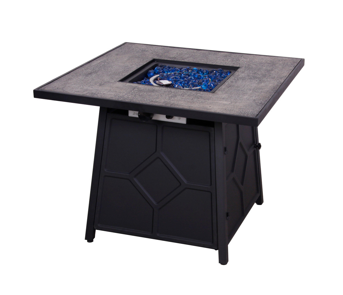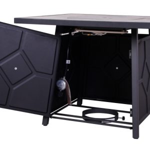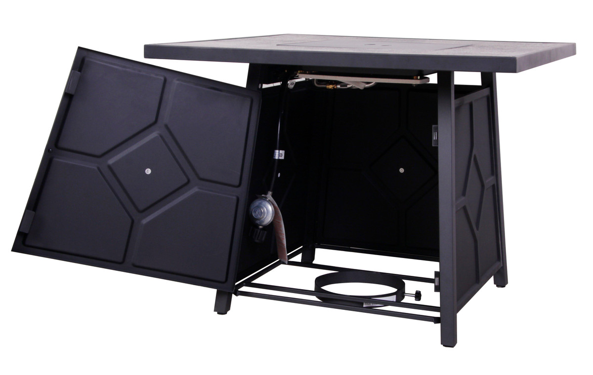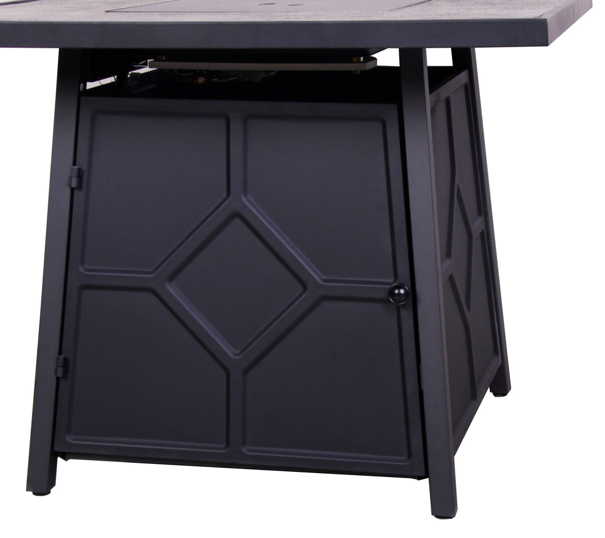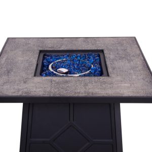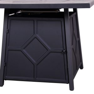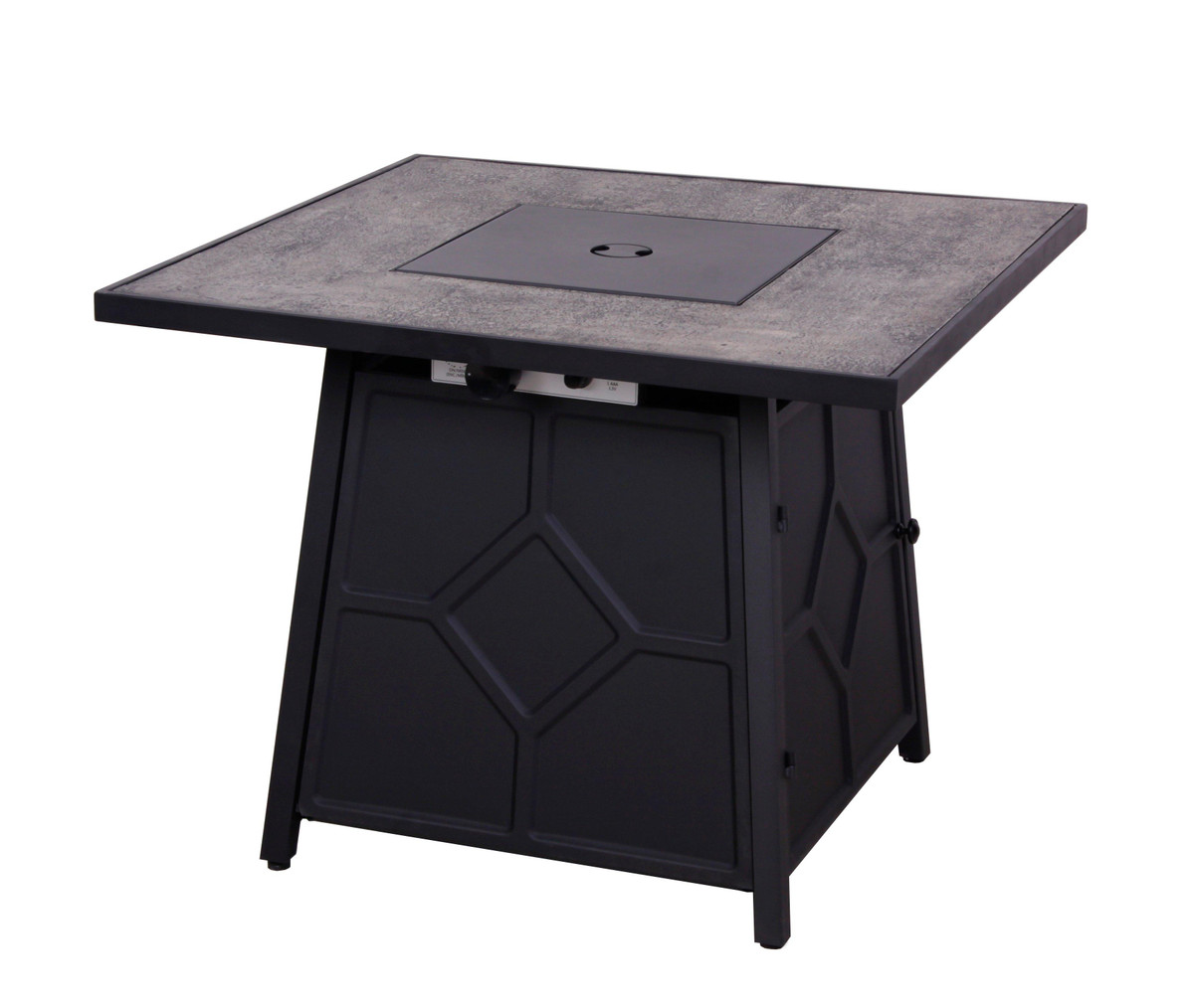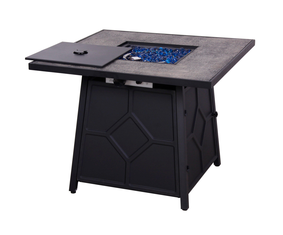 Welcome to the Heat Maxx 40000 BTU 32 in. Square Propane Firepit! Its unique pyramidal design and large faux stone tabletop make it multifunctional, easily converting to an outdoor table with the included cover. The ceramic stone print tabletop and stamped powder-coated steel sidewalls ensure durability. Featuring push/turn piezo ignition and space for a 20 lb. propane tank (not included), it also comes with glass bezels and a PVC weatherproof cover. Measures 32 in. x 32 in. x 25 in. H.