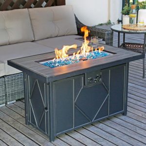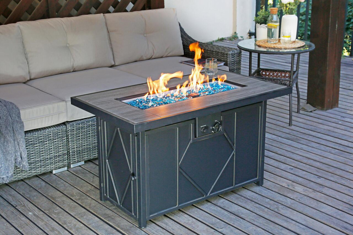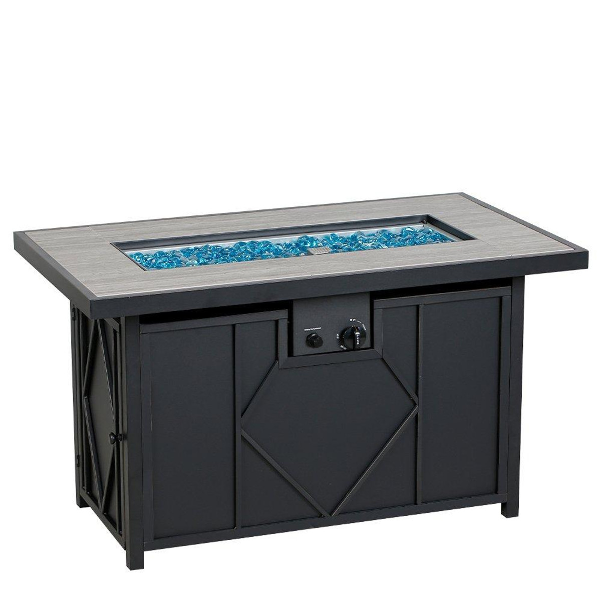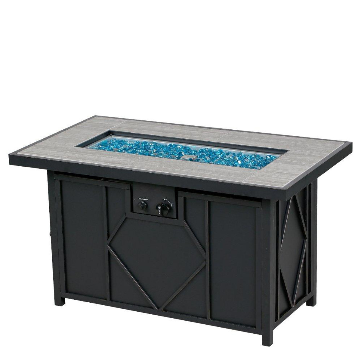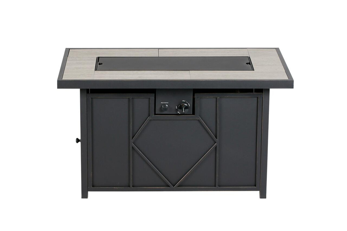 Keep it cozy outside with the Heat Maxx 60,000 BTU 42 in. Rectangular Propane Firepit. It features sturdy steel construction with stamped sidewalls and a grey faux wood tile tabletop. The zinc-coated fire bowl and decorative stamped steel sidewalls add both durability and style. This firepit includes a piezo push-button ignition and space for a 20 lbs. propane tank (not included). Great with outdoor couches and sectionals. Glass bezels are included. Measures 42 in. x 24 in. x 24.4 in. H.