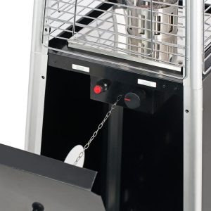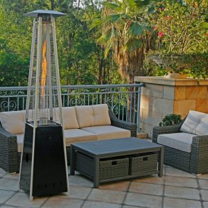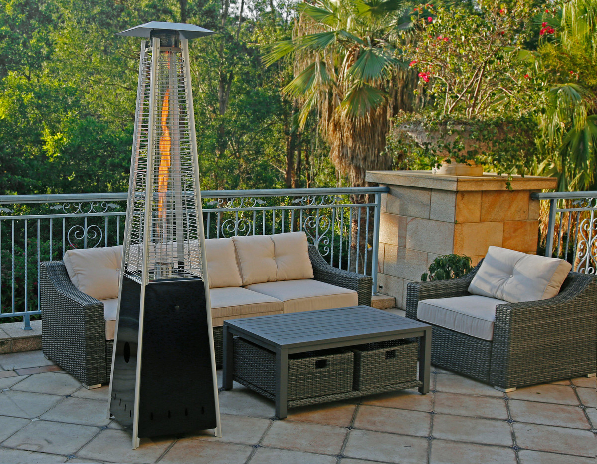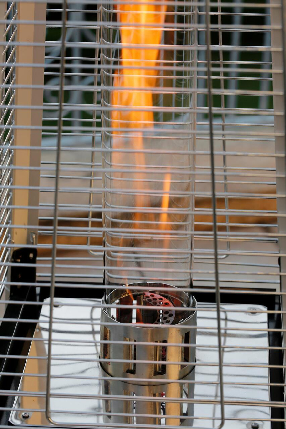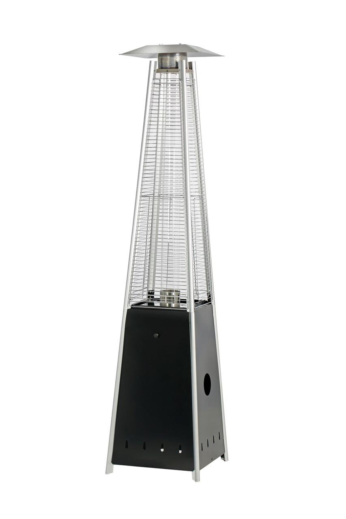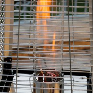 Enjoy outdoor style and ambiance with the Heat Maxx 84 in. Tower Patio Heater. This four-sided tower flame heater is ideal for areas with limited space, requiring just a 21-inch footprint. The patented Spiral Flame emitter creates a stunning dancing flame effect in a Borosilicate glass tube. It features a smooth action push/turn electronic ignition and includes a wheel kit for easy mobility. 20 lb. propane tank (not included). CSA certified for safety. Measures 20.5 in. x 24.5 in. x 84 in. H.