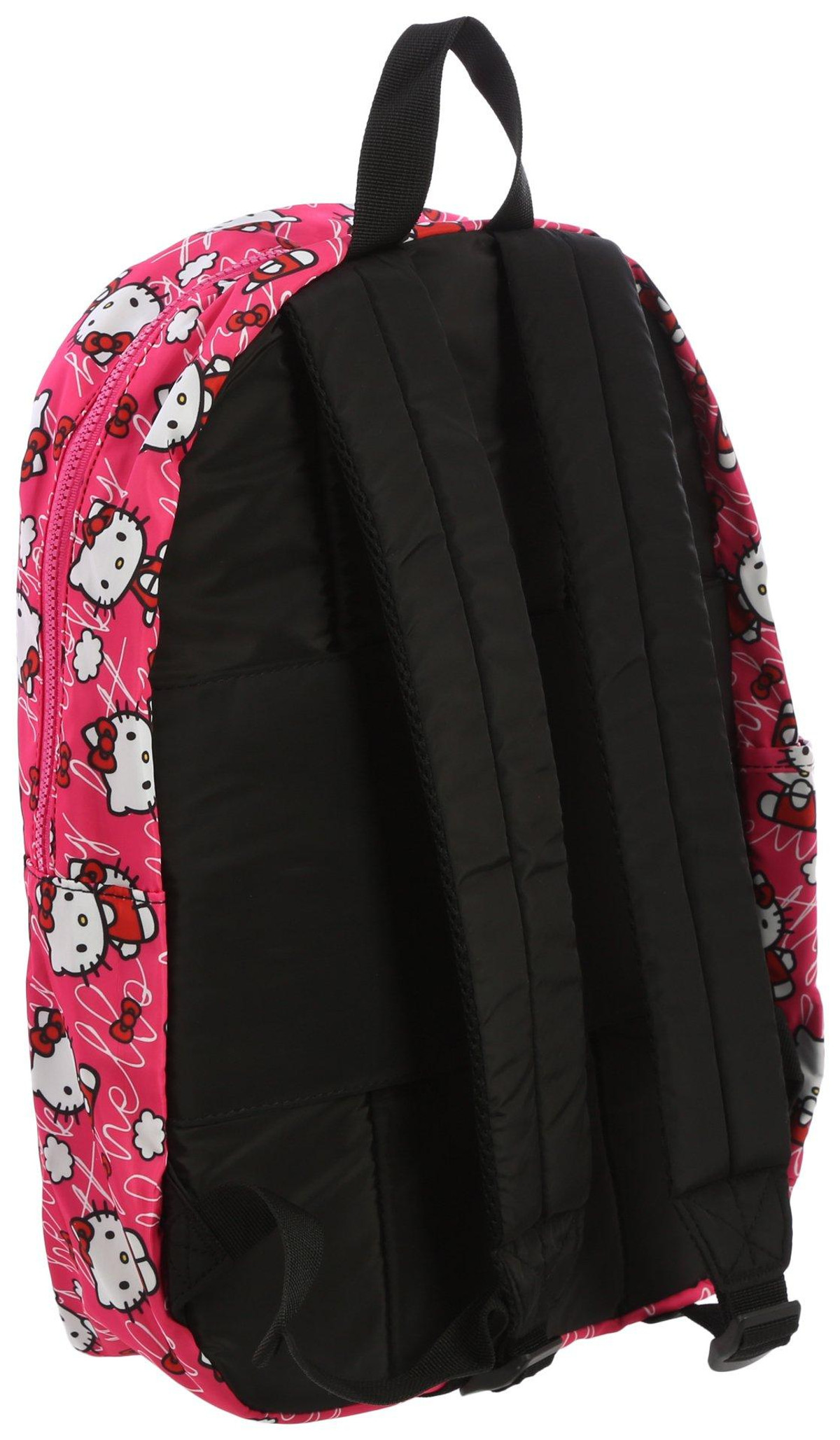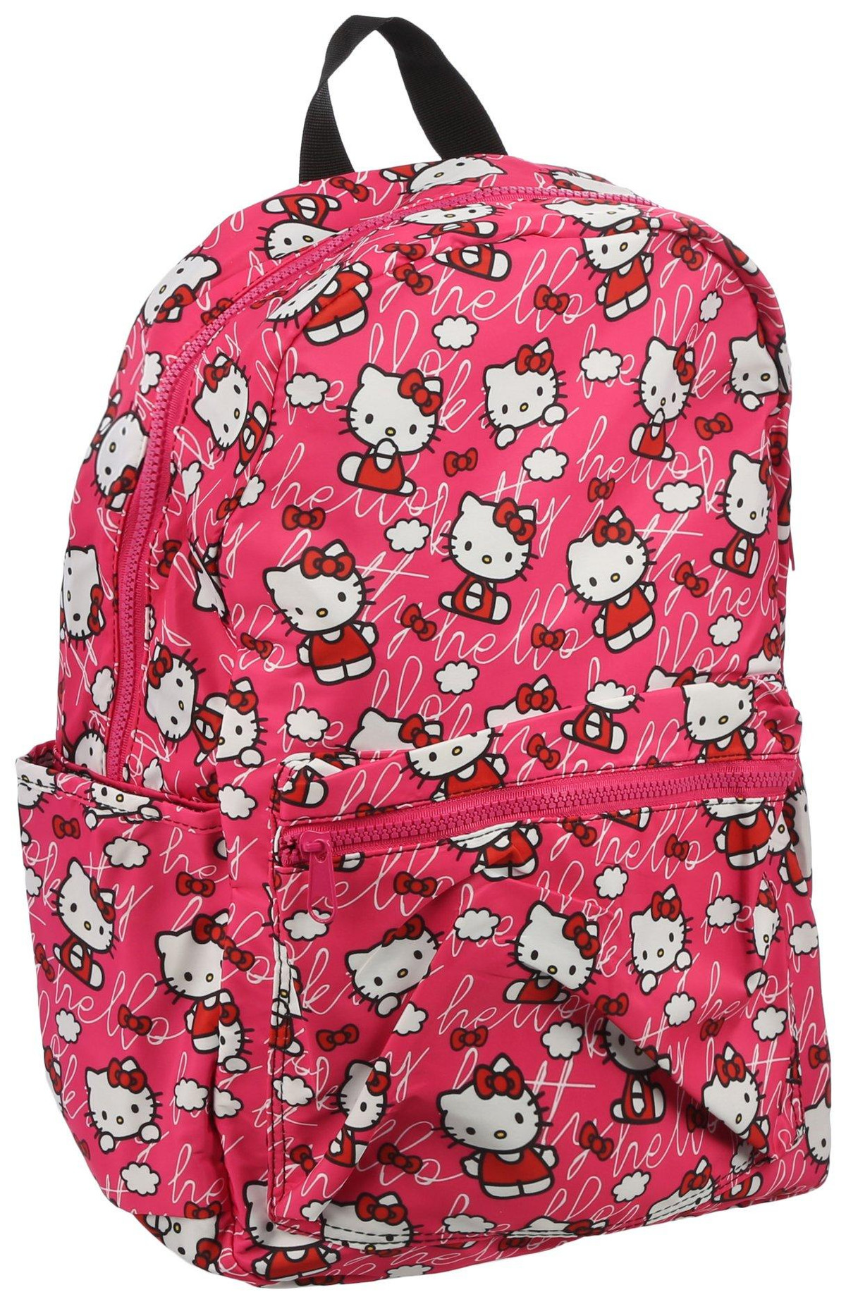 Introducing the Kids Hello Kitty Print Backpack, a delightful and functional accessory for young fans. This backpack features a top zip compartment with an inner slip pocket for a laptop, a front zip pocket for easy access to essentials, adjustable straps for a comfortable fit, and a side water bottle pocket. Measuring 17 in. x 12 in., its perfect for school, travel, or everyday adventures. The adorable Hello Kitty print adds a fun and playful touch to any outfit.