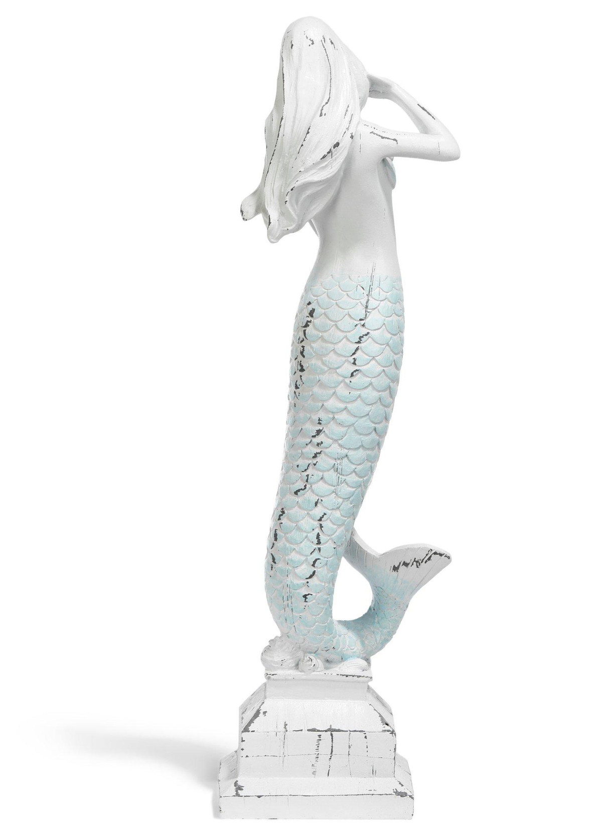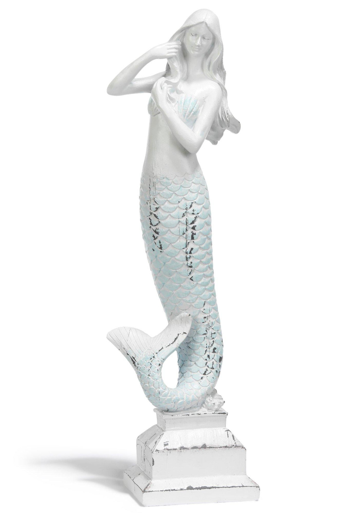 Add coastal charm with this 17-inch resin mermaid accent, featuring a detailed, lifelike design atop a pedestal. Perfect for mantels, shelves, or coffee tables, it brings a touch of ocean-inspired elegance to any beach-themed space. Fabrication is 100% resin. Measures approximately 17 in x 4 in x 3.5 in.