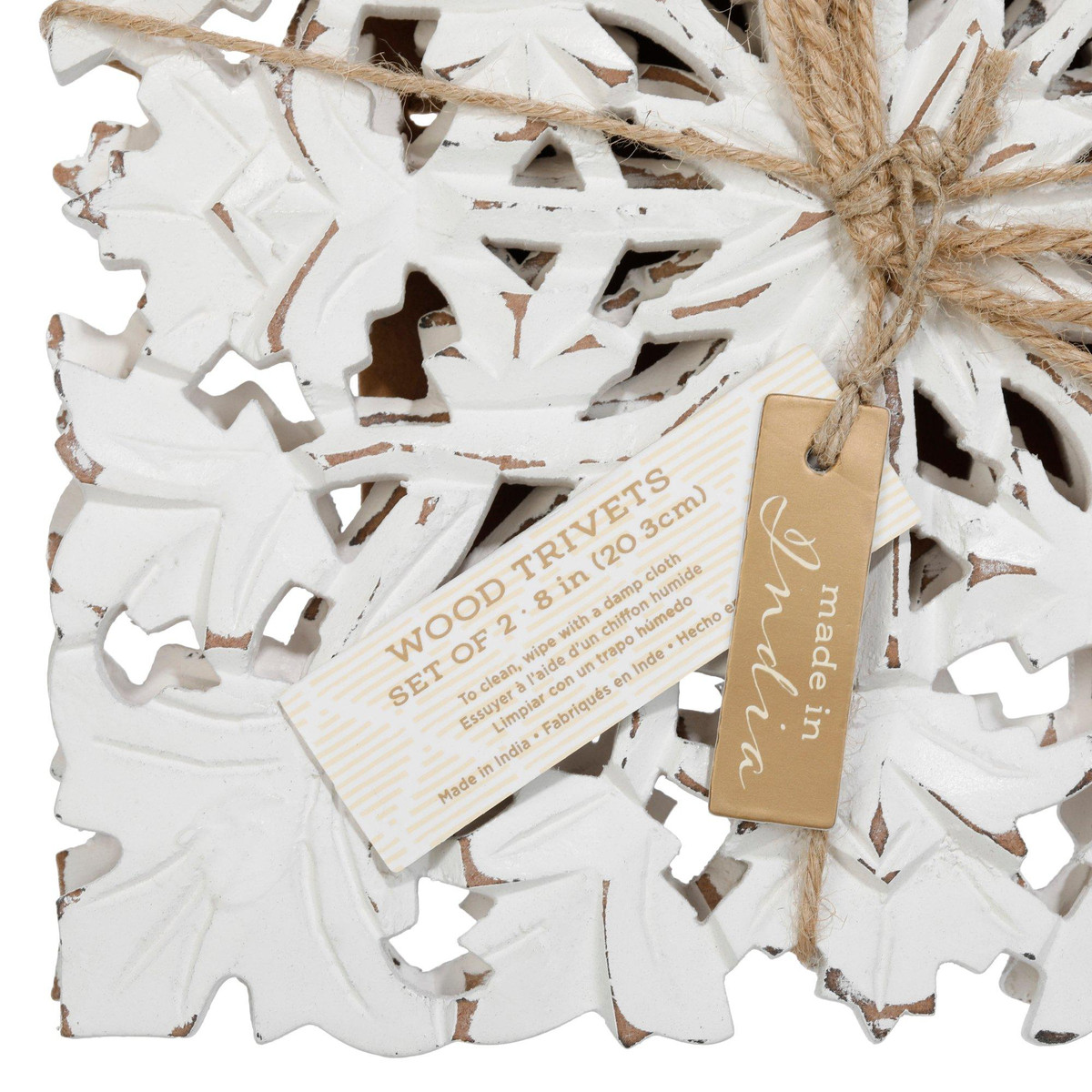 Protect your surfaces in style with this 2 pk Square Wood Trivets, expertly crafted from 100% natural wood. Designed to withstand heat, each trivet provides a reliable barrier between hot cookware and your countertops or table. Their warm, rustic finish adds an organic touch to any kitchen or dining space. Perfect for daily use or entertaining, these versatile trivets blend functionality with timeless charm. Fabrication is 100% wood. Each trivet measures approximately 8 in x 8 in.