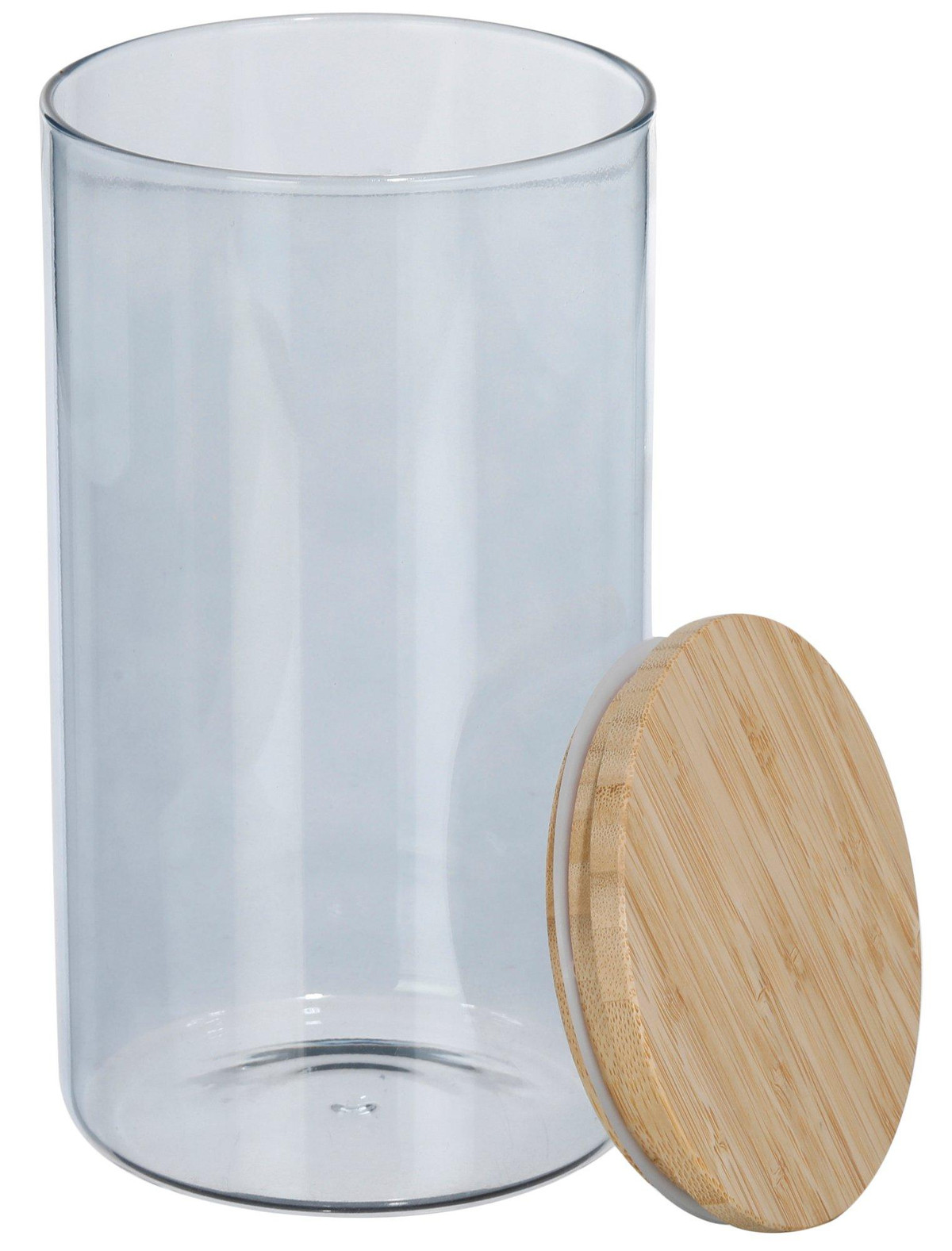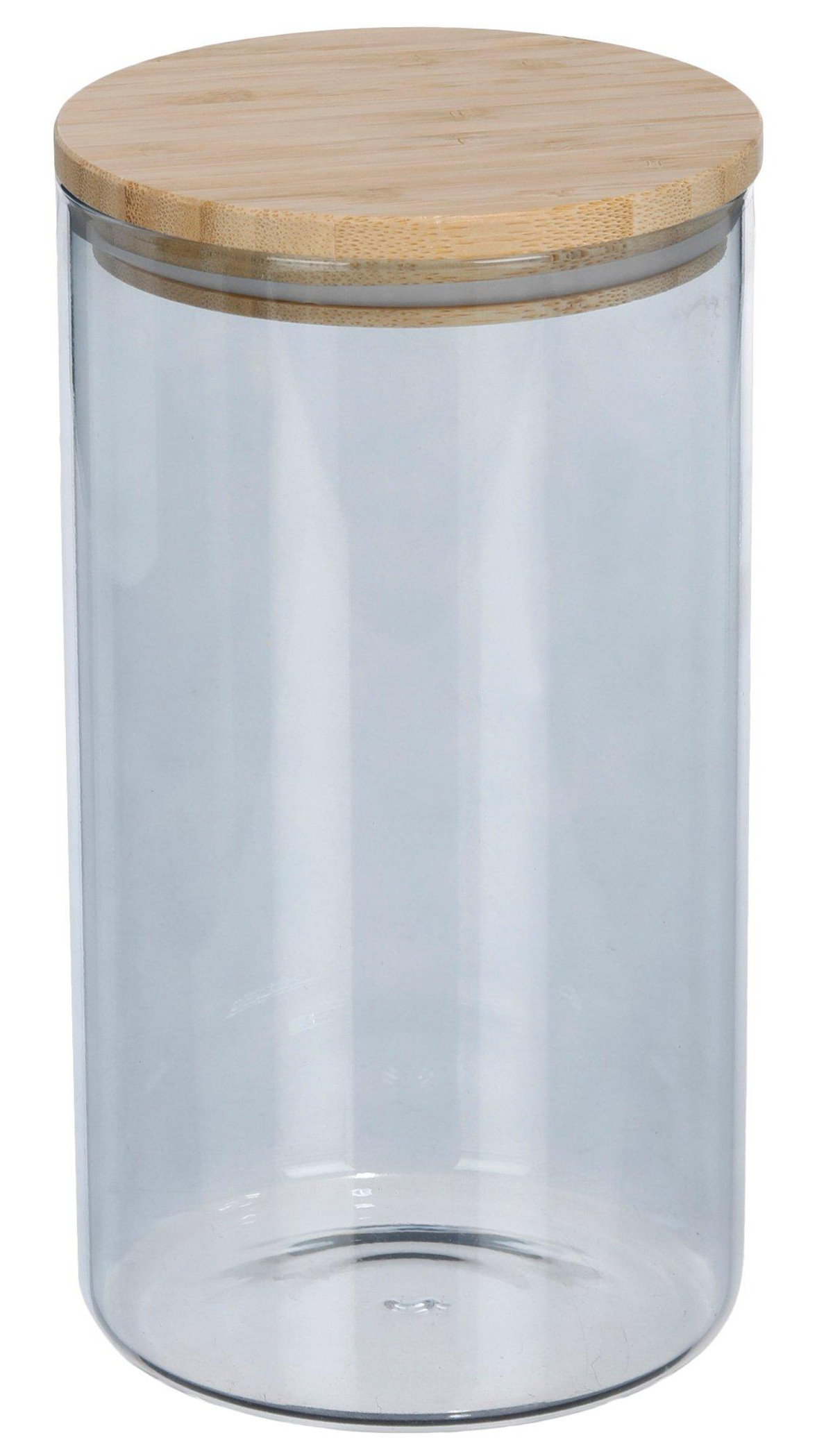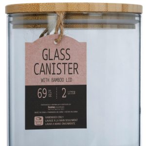 Keep your kitchen stylish and organized with this 69 oz blue glass canister. Ideal for storing pasta, rice, coffee, and more, it features a clear-tinted design for easy viewing and an airtight bamboo lid to lock in freshness. A sleek, modern touch for any countertop. Measures approximately 9 in x 5 in round.