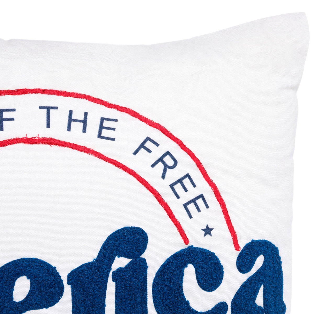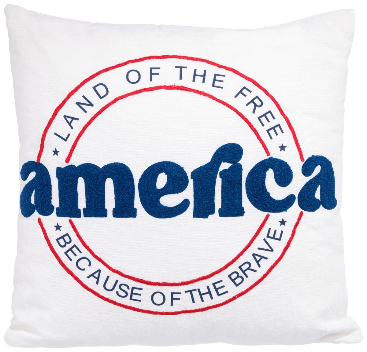Celebrate the spirit of America with this charming patriotic décor pillow. Featuring embroidered america with the proud saying Land of the free, Because of the brave it brings a cozy Americana touch to any space. Measures approximately 18 in x 18 in.