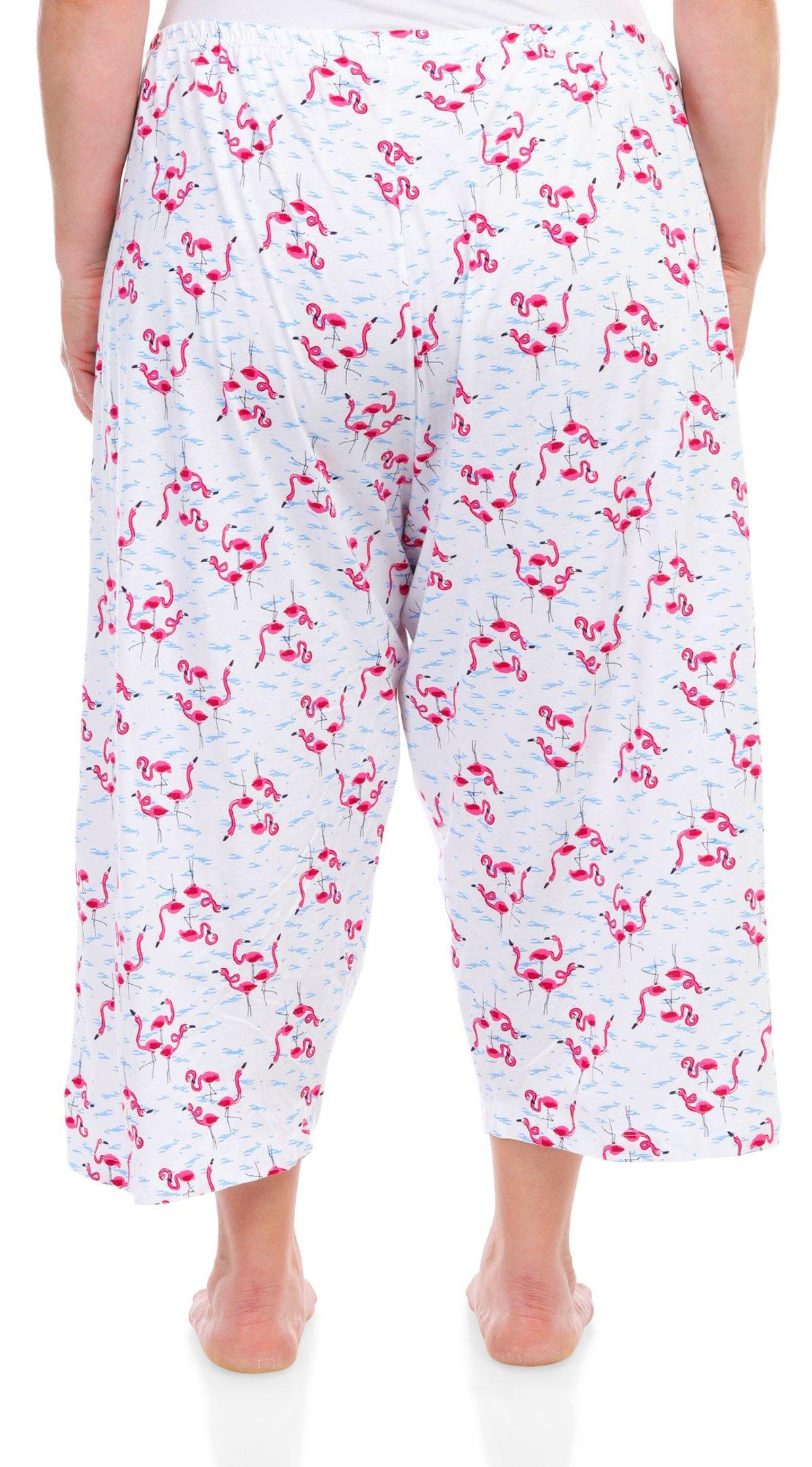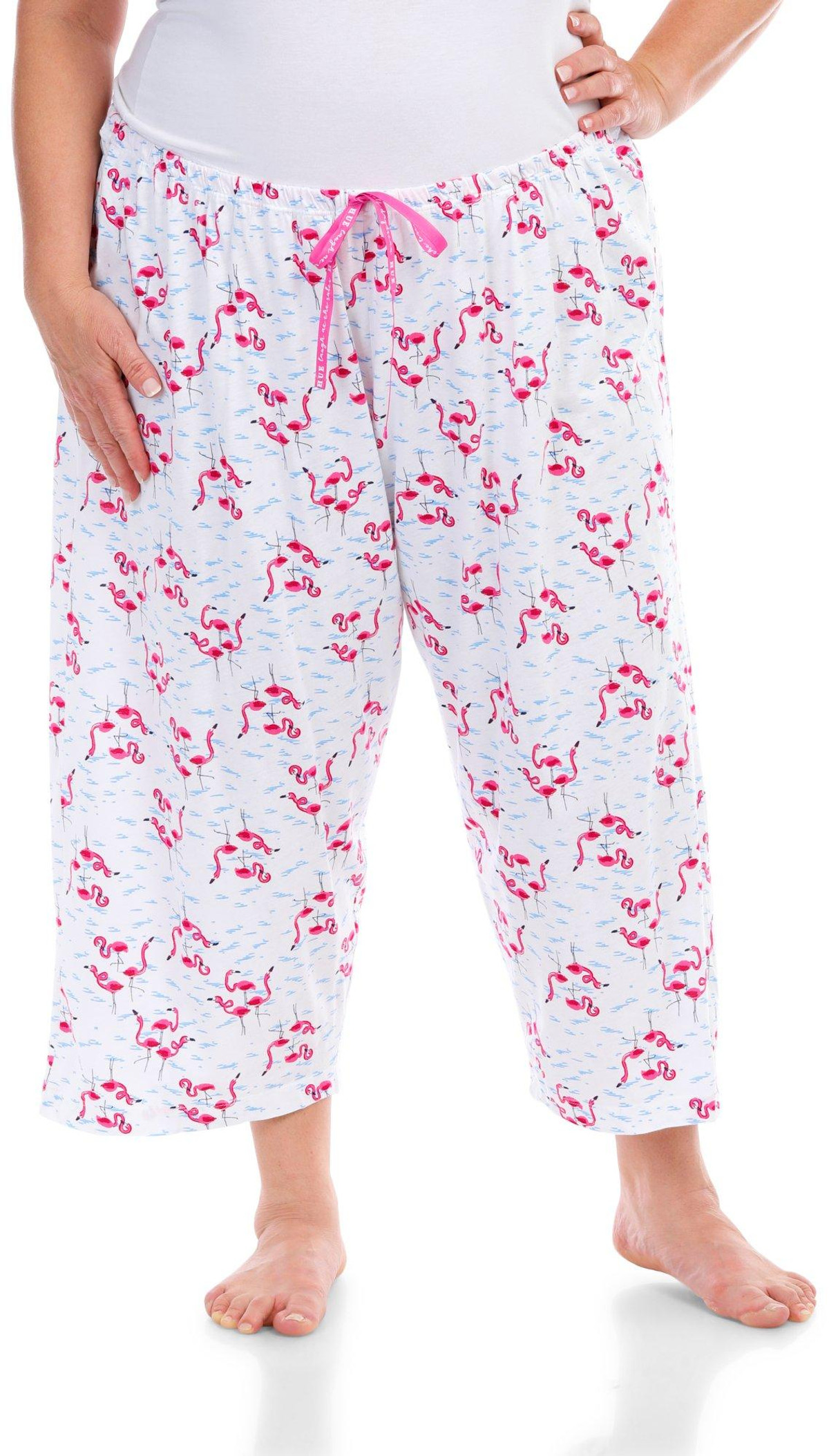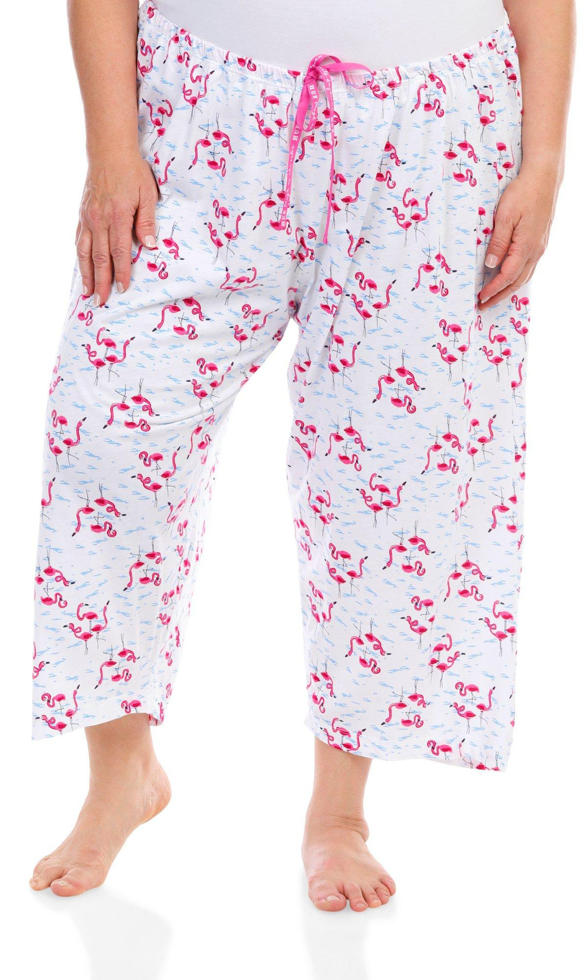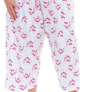 Stay cool and stylish with these Drawstring Sleep Capris. Featuring a playful flamingo print pattern, these capris add a fun touch to your nighttime wardrobe. The drawstring waistband ensures a comfortable and adjustable fit, while the temperature-regulating fabric keeps you cool throughout the night. Perfect for warm nights or lounging at home, these sleep capris combine comfort and style effortlessly. Fabrication is 60% cotton and 40% rayon.