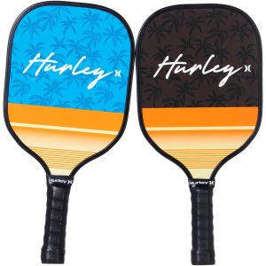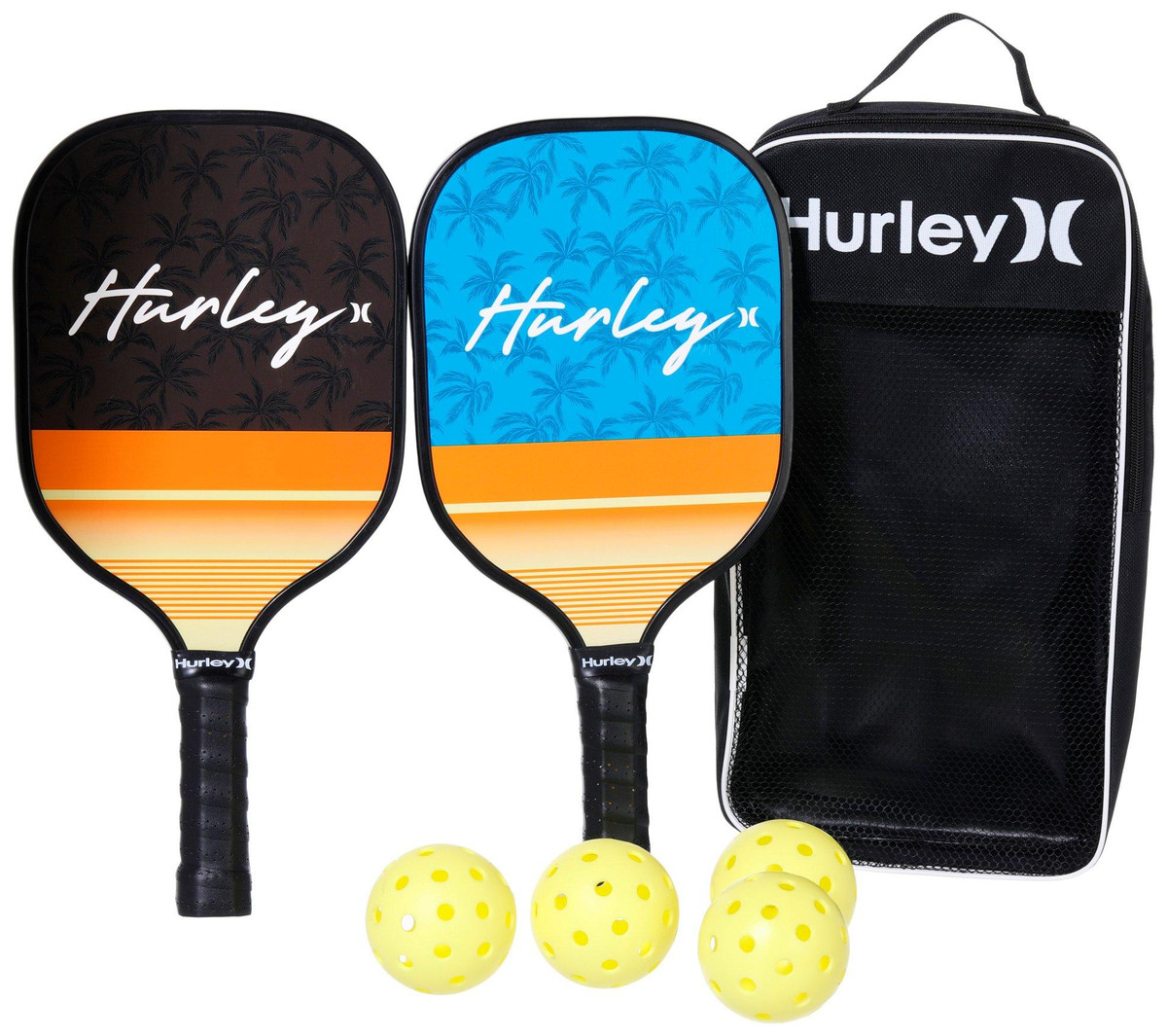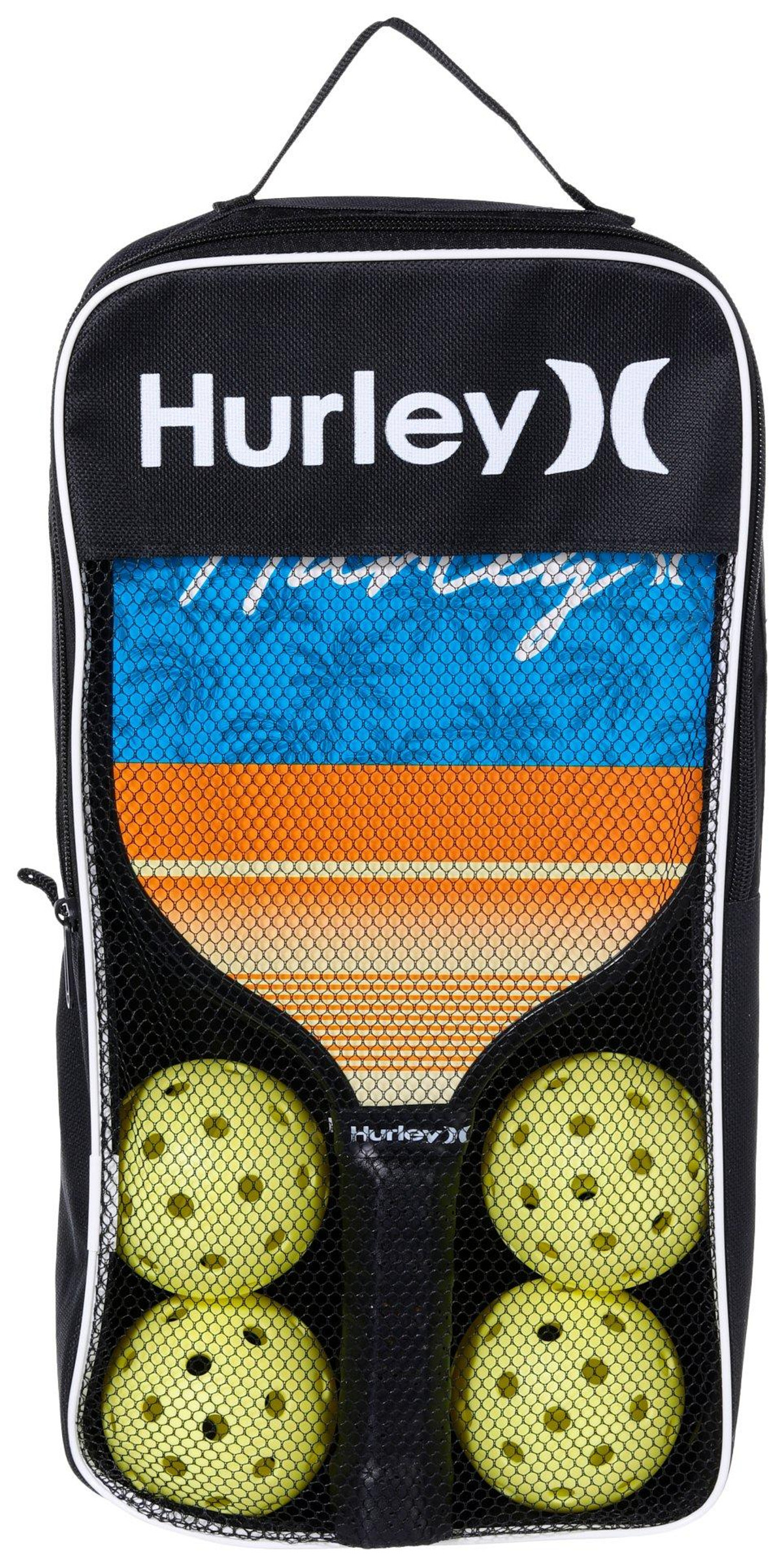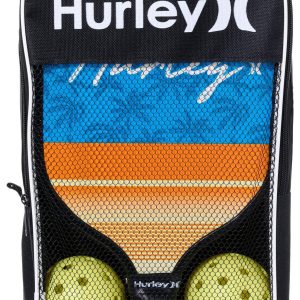 Hurley offers durable paddles and accessories for the perfect pickleball game. This professional quality paddle and ball set features a sturdy aluminum construction, vibrant solid color balls and comfort grip handles. Set includes two paddles, four balls and one carry case.