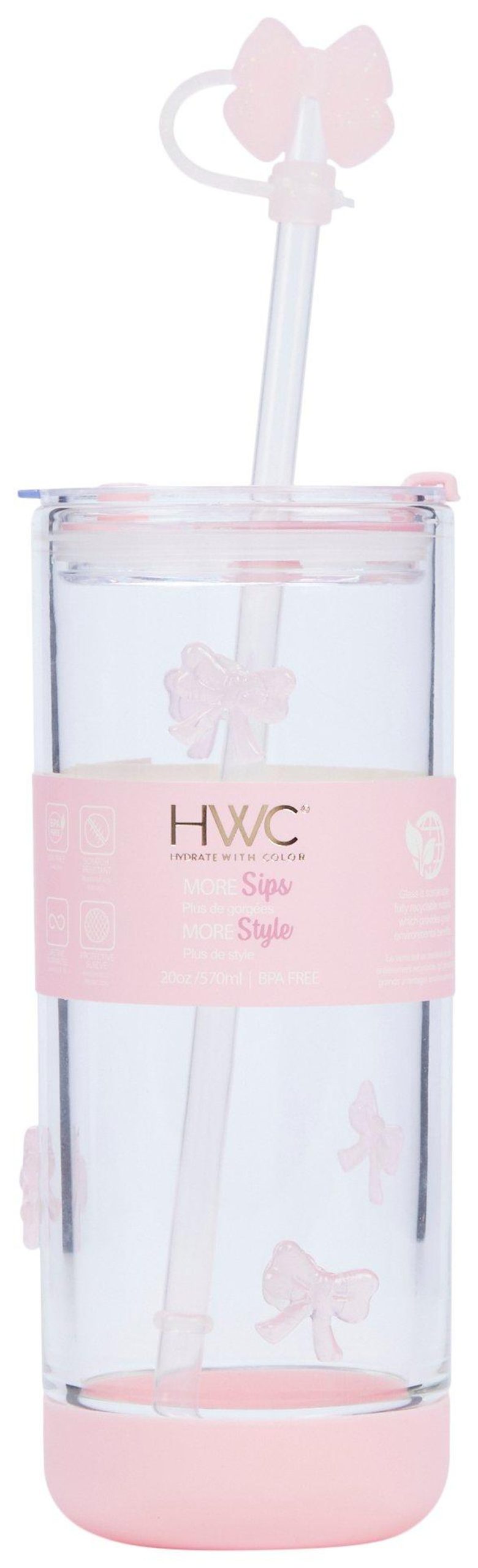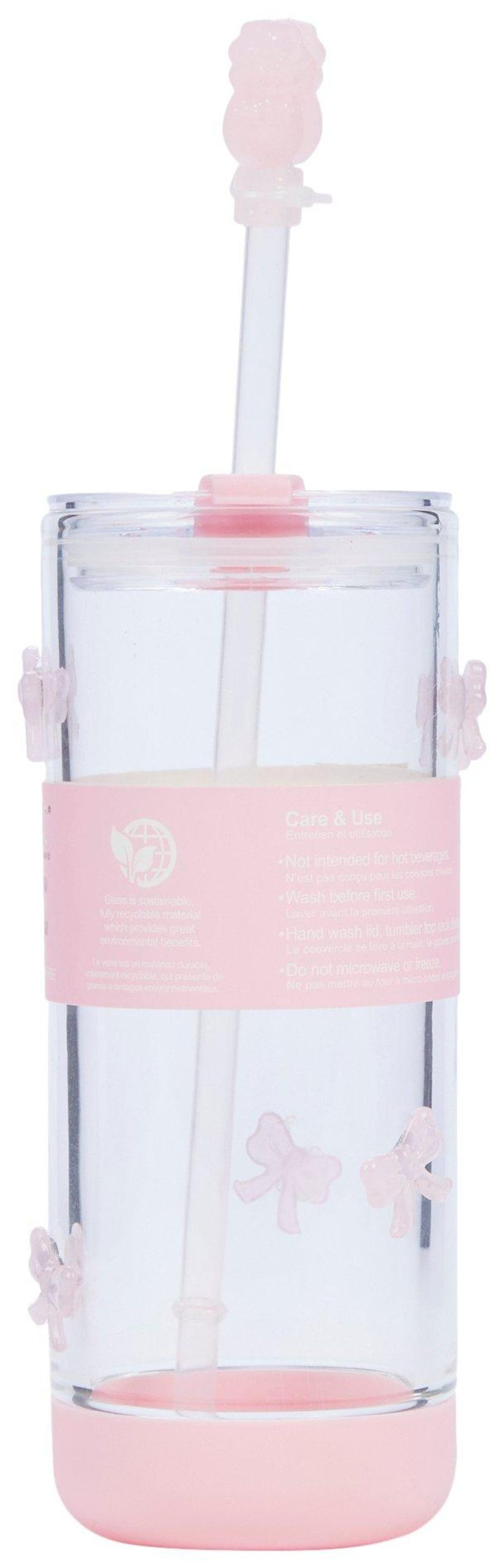 Sip in style with this 20 oz Glass Bow Tumbler! Featuring a matching straw and adorable bow-shaped topper, it is designed with scratch resistance, a BPA-free build, and a protective sleeve for on-the-go ease. Perfect for adding charm to your daily hydration!