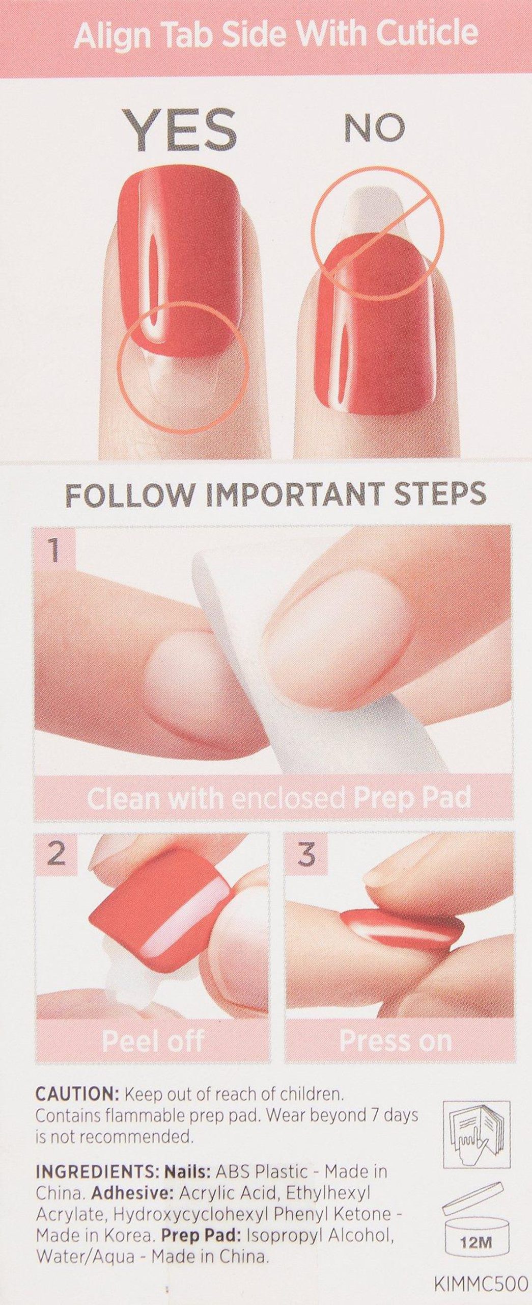 Includes a set of 30 pre-glued nails. Features solid, faux tip details. Printed with soy ink. Expiration 12 months from first use.