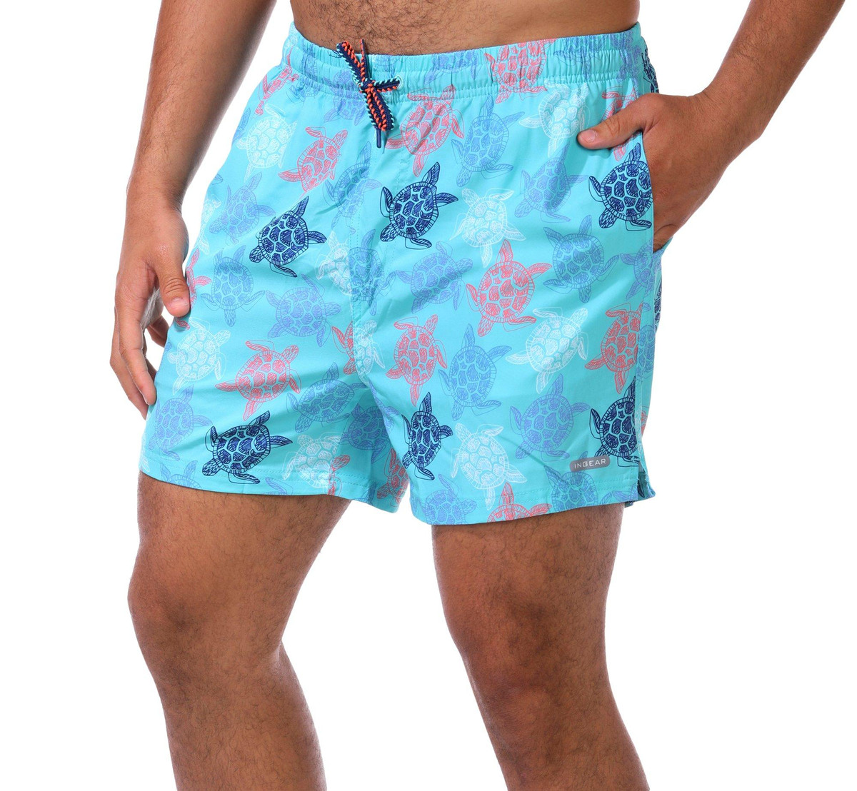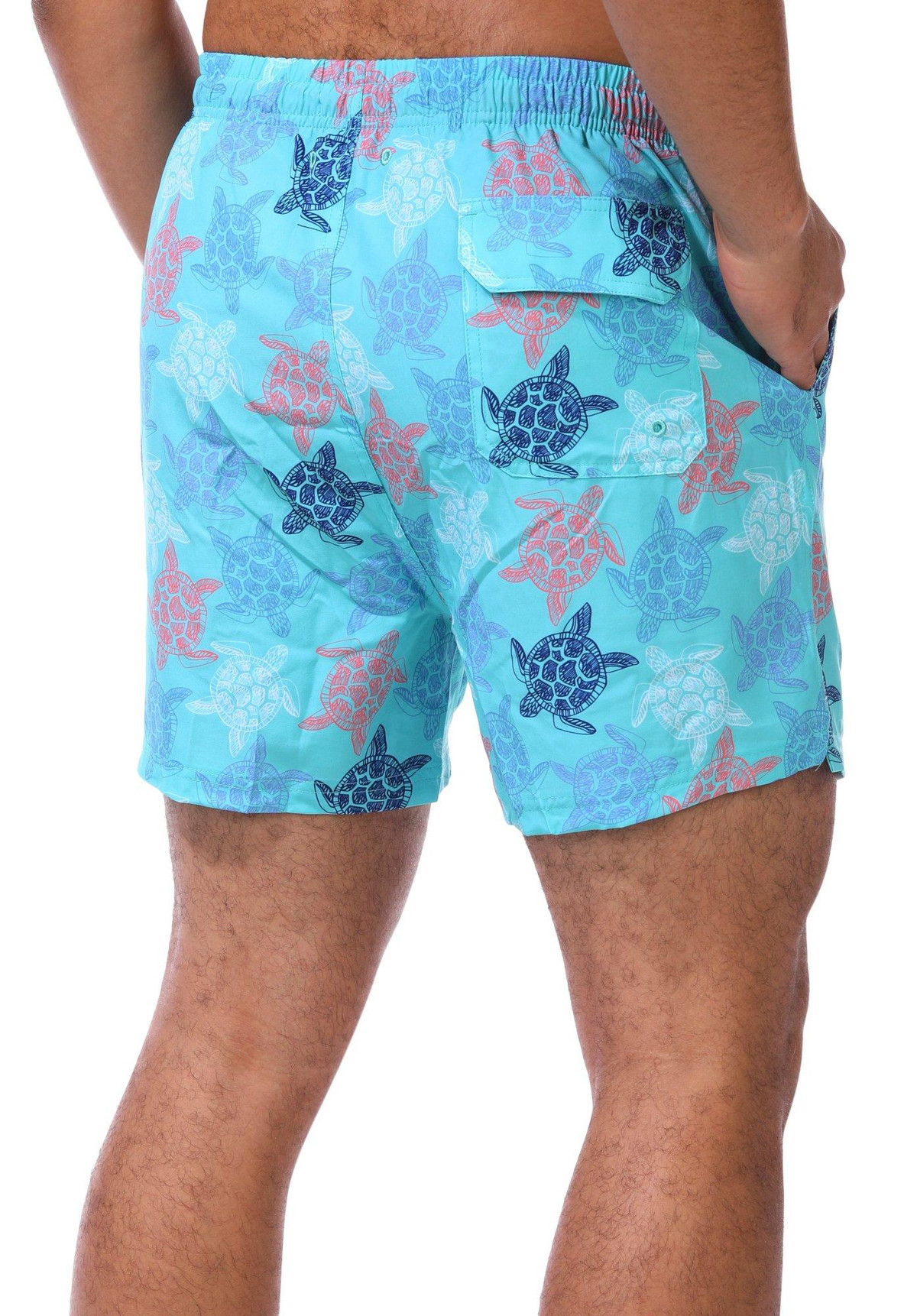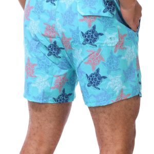The Men’s Sea Turtle Print Swim Shorts feature a playful sea turtle print with a drawstring waistband for a secure fit. Designed with side seam pockets, one back pocket, and a full inner boxer lining, they offer comfort and support for all-day fun in the water.