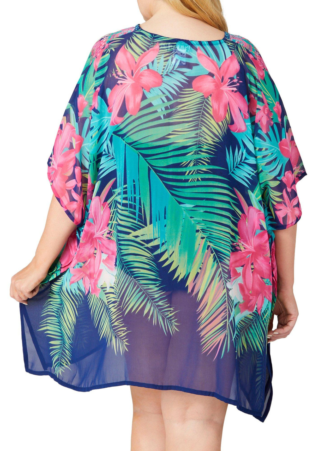 Introducing the Plus Tropical Print Swim Caftan, made from 100% polyester for a lightweight and breezy feel. This stylish caftan features a vibrant tropical print, short sleeves, and a flowy fit, making it the perfect cover-up for your beach or poolside adventures. Enjoy comfort and style with this must-have swimwear accessory.
