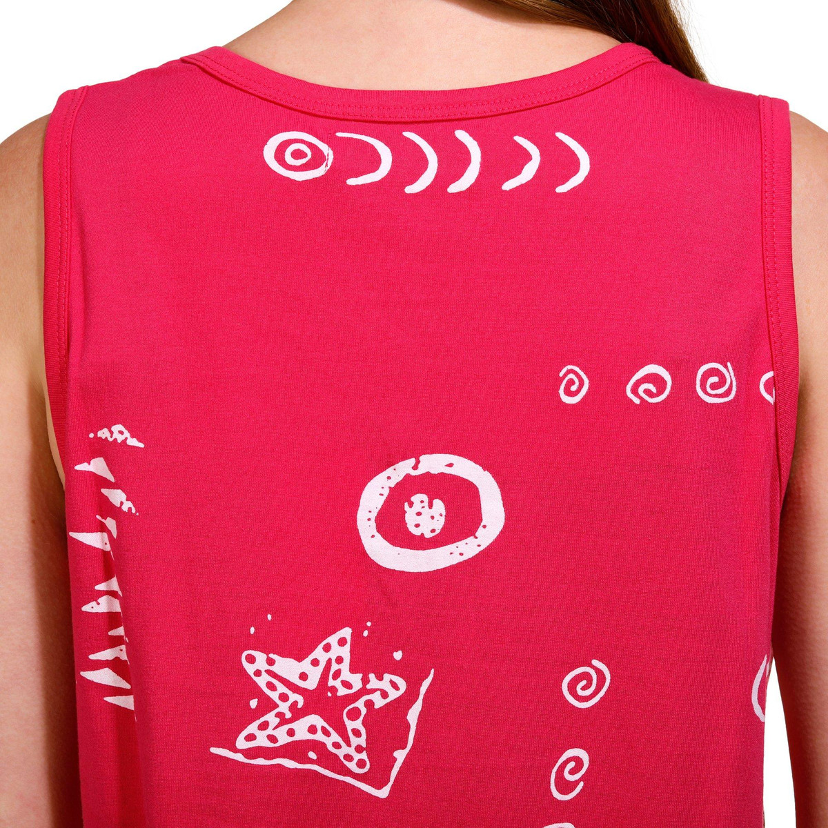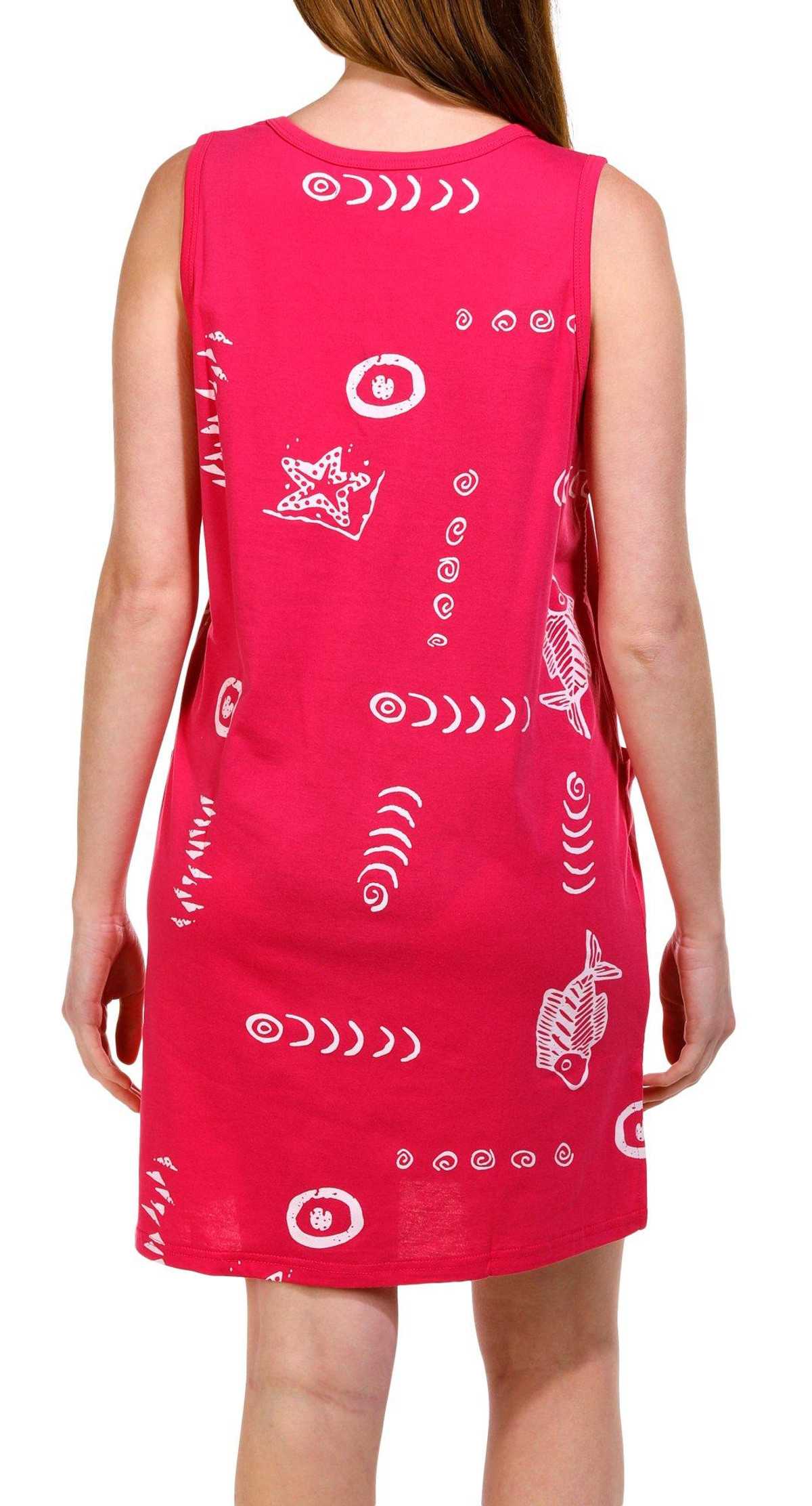 This sleeveless coverup features a solid color design on lightweight knit fabric with an all over fish screen print, a v-neckline, two front pockets and relaxed styling.