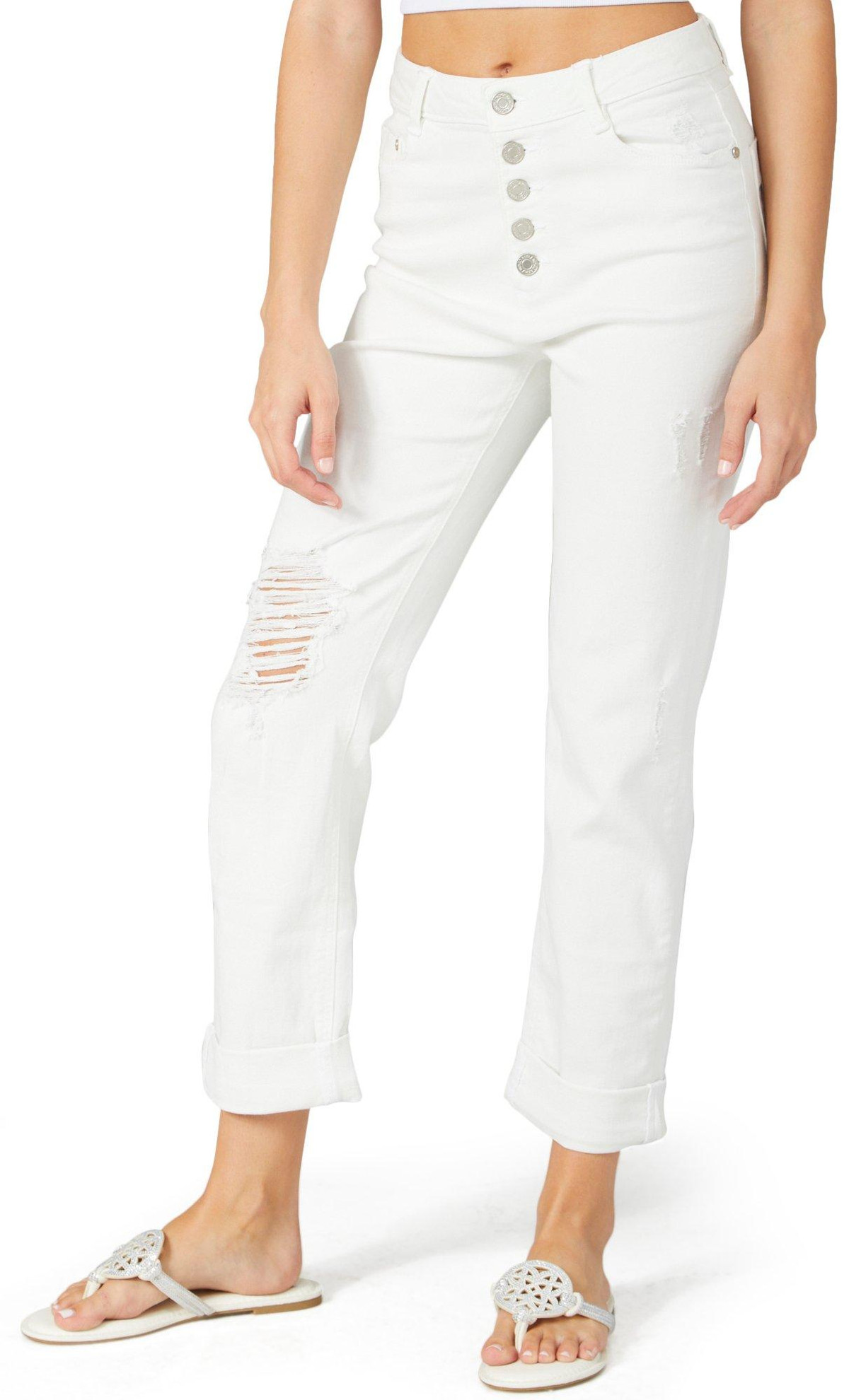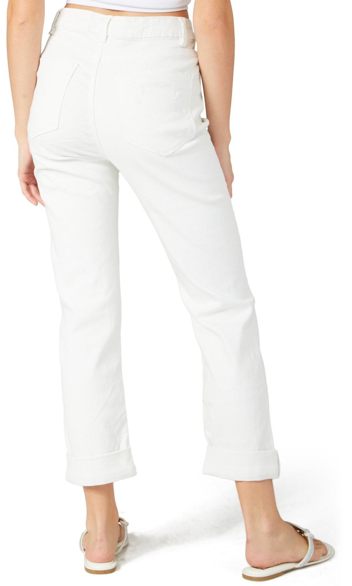 Upgrade your denim collection with our Juniors Straight Leg Roll Cuff Jeans. Made from a blend of cotton, polyester, viscose, and spandex, these jeans feature a stylish solid color and a button-fly closure. The classic 5-pocket cut and roll cuff hem add a trendy touch, while the super high-rise straight leg fit ensures comfort and a flattering silhouette. Perfect for casual or dressed-up looks, these jeans combine fashion and functionality effortlessly.
